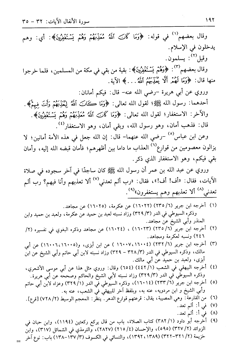 وقَالَ بَعْضُهُمْ: (وَهُمْ يَسْتَغْفِرُونَ): بقية من بقي في مكة من المسلمين، فلما خرجوا منها قال: (وَمَا لَهُمْ أَلَّا يُعَذِّبَهُمُ اللَّهُ ... (34)