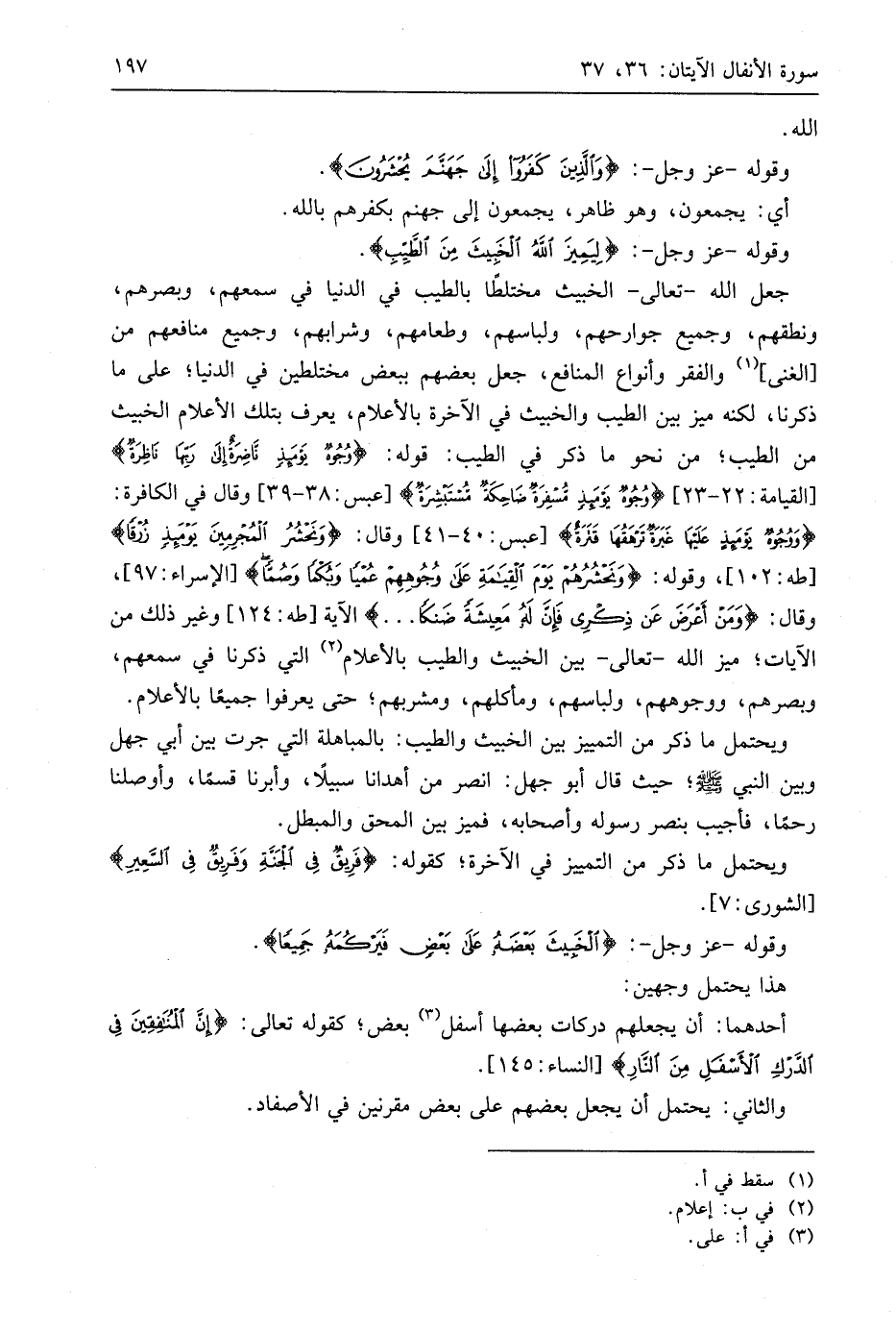 ويحتمل ما ذكر من التمييز بين الخبيث والطيب: بالمباهلة التي جرت بين أبي جهل وبين النبي - صَلَّى اللَّهُ عَلَيهِ وَسَلَّمَ -؛ حيث قال أبو جهل: انصر من أهدانا سبيلًا، وأبرنا قسمًا، وأوصلنا رحمًا، فأجيب بنصر رسوله وأصحابه، فميز بين المحق والمبطل.
