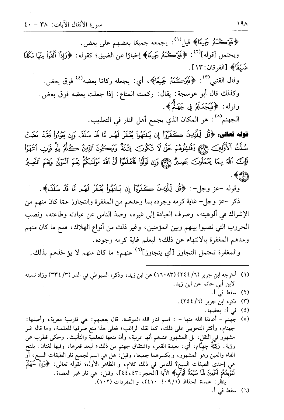 قوله تعالى: (قُلْ لِلَّذِينَ كَفَرُوا إِنْ يَنْتَهُوا يُغْفَرْ لَهُمْ مَا قَدْ سَلَفَ وَإِنْ يَعُودُوا فَقَدْ مَضَتْ سُنَّتُ الْأَوَّلِينَ (38) وَقَاتِلُوهُمْ حَتَّى لَا تَكُونَ فِتْنَةٌ وَيَكُونَ الدِّينُ كُلُّهُ لِلَّهِ فَإِنِ انْتَهَوْا فَإِنَّ اللَّهَ بِمَا يَعْمَلُونَ بَصِيرٌ (39) وَإِنْ تَوَلَّوْا فَاعْلَمُوا أَنَّ اللَّهَ مَوْلَاكُمْ نِعْمَ الْمَوْلَى وَنِعْمَ النَّصِيرُ (40)