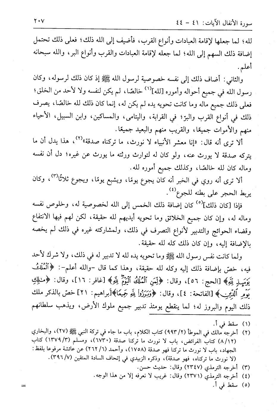 ولما كانت نفس رسول اللَّه - صَلَّى اللَّهُ عَلَيهِ وَسَلَّمَ - وما تحويه يده لله لا تدبير له في ذلك، ولا شرك لأحد فيه، خصّ بإضافة ذلك إليه وكله لله حقيقة، وهذا كما قال - واللَّه أعلم -: (الْمُلْكُ يَوْمَئِذٍ لِلَّهِ)، وقال: (لِمَنِ الْمُلْكُ الْيَوْمَ لِلَّهِ)، وقال: (مَالِكِ يَوْمِ الدِّينِ)، وقال: (وَبَرَزُوا لِلَّهِ جَمِيعًا)، خصّ بالذكر ملك ذلك اليوم والبروز له؛ لما ينقطع يومئذ تدبير جميع ملوك الأرض، ويذهب سلطانهم