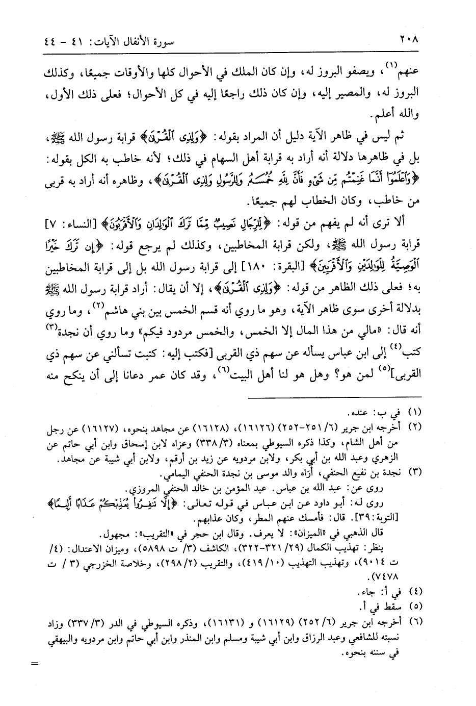 ألا ترى أنه لم يفهم من قوله: (لِلرِّجَالِ نَصِيبٌ مِمَّا تَرَكَ الْوَالِدَانِ وَالْأَقْرَبُونَ)، قرابة رسول اللَّه - صَلَّى اللَّهُ عَلَيهِ وَسَلَّمَ -، ولكن قرابة المخاطبين، وكذلك لم يرجع قوله: (إِنْ تَرَكَ خَيْرًا الْوَصِيَّةُ لِلْوَالِدَيْنِ وَالْأَقْرَبِينَ)، إلى قرابة رسول اللَّه بل إلى قرابة المخاطبين به؛ فعلى ذلك الظاهر من قوله: (وَلِذِي الْقُرْبَى)، إلا أن يقال: أراد قرابة رسول اللَّه - صَلَّى اللَّهُ عَلَيهِ وَسَلَّمَ - بدلالة أخرى سوى ظاهر الآية، وهو ما روي أنه قسم الخمس بين بني هاشم، وما روي أنه - صَلَّى اللَّهُ عَلَيهِ وَسَلَّمَ - قال: " مالي من هذا المال إلا الخمس، والخمس مردود فيكم " وما روي أن نجدة كتب إلى ابن عَبَّاسٍ يسأله عن سهم ذي القربى فكتب إليه: كتبت تسألني عن سهم ذي القربى لمن هو؟ وهل هو لنا أهل البيت، وقد كان عمر دعانا إلى أن ينكح منه