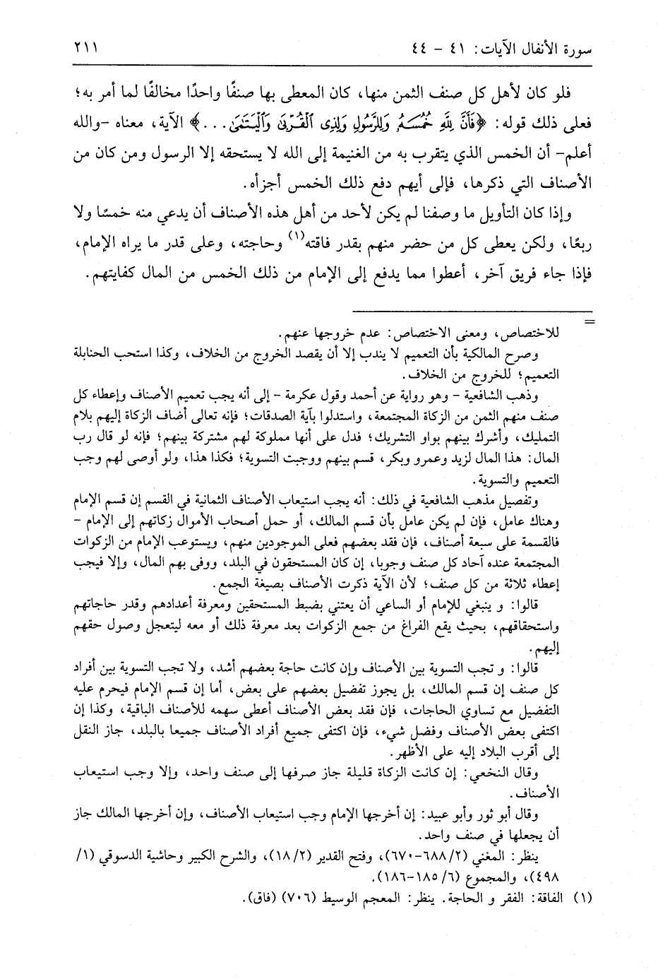 وإذا كان التأويل ما وصفنا لم يكن لأحد من أهل هذه الأصناف أن يدعي منه خمسًا ولا ربعًا، ولكن يعطى كل من حضر منهم بقدر فاقته وحاجته، وعلى قدر ما يراه الإمام، فإذا جاء فريق آخر، أعطوا مما يدفع إلى الإمام من ذلك الخمس من المال كفايتهم.
