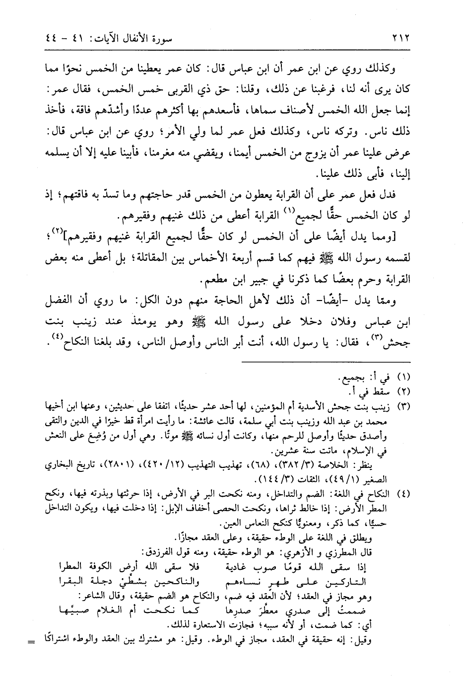 وكذلك روي عن ابن عمر أن ابن عَبَّاسٍ قال: كان عمر يعطينا من الخمس نحوًا مما كان يرى أنه لنا، فرغبنا عن ذلك، وقلنا: حق ذي القربى خمس الخمس، فقال عمر: إنما جعل اللَّه الخمس لأصناف سماها، فأسعدهم بها أكثرهم عددًا وأشدهم فاقة، فأخذ ذلك ناس. وتركه ناس، وكذلك فعل عمر لما ولي الأمر؛ روي عن ابن عَبَّاسٍ قال: عرض علينا عمر أن يزوج من الخمس أيمنا، ويقضي منه مغرمنا، فأبينا عليه إلا أن يسلمه إلينا، فأبى ذلك علينا.