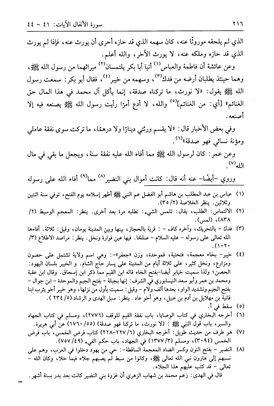 وعن عائشة أن فاطمة والعباس أتيا أبا بكر يلتمسان ميراثهما من رسول اللَّه - صَلَّى اللَّهُ عَلَيهِ وَسَلَّمَ - وهما حينئذ يطلبان أرضه من فدك، وسهمه من خيبر، فقال أبو بكر: سمعت رسول اللَّه - صَلَّى اللَّهُ عَلَيهِ وَسَلَّمَ - يقول: " لا نورث، ما تركناه صدقة، إنما يأكل آل مُحَمَّد في هذا المال حق الغنائم " أي: من الغنائم، واللَّه، لا أدع أمرًا رأيت رسول اللَّه - صَلَّى اللَّهُ عَلَيهِ وَسَلَّمَ - يصنعه فيه إلا أصنعه.
