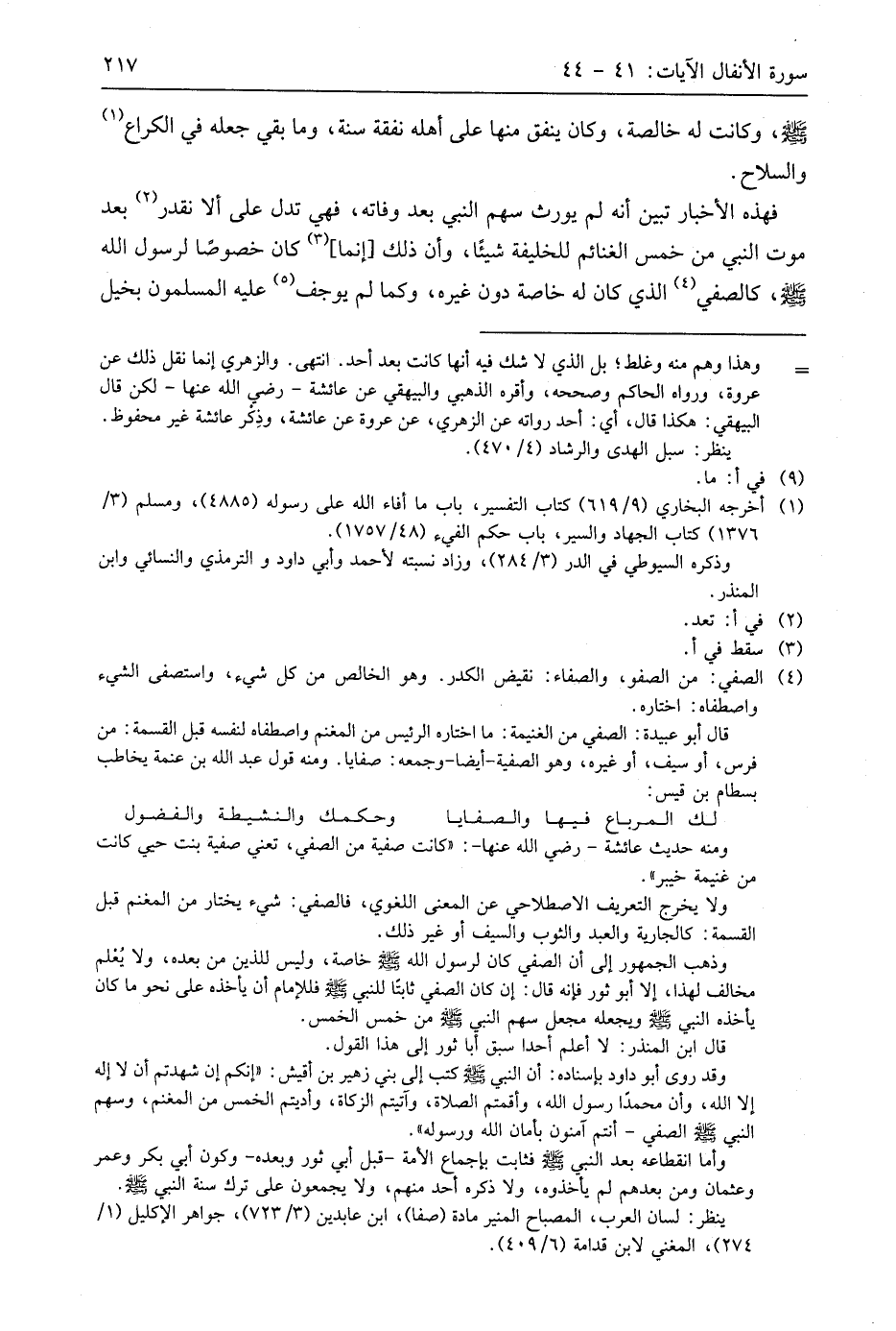فهذه الأخبار تبين أنه لم يورث سهم النبي بعد وفاته، فهي تدل على ألا نقدر بعد موت النبي من خمس الغنائم للخليفة شيئًا، وأن ذلك إنما كان خصوصًا لرسول الله - صَلَّى اللَّهُ عَلَيهِ وَسَلَّمَ -، كالصفي الذي كان له خاصة دون غيره، وكما لم يوجف عليه المسلمون بخيل
