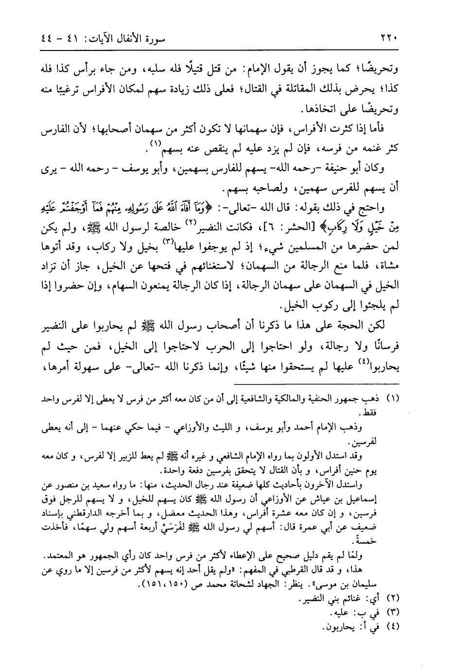 واحتج في ذلك بقوله: قال اللَّه - تعالى -: (وَمَا أَفَاءَ اللَّهُ عَلَى رَسُولِهِ مِنْهُمْ فَمَا أَوْجَفْتُمْ عَلَيْهِ مِنْ خَيْلٍ وَلَا رِكَابٍ)، فكانت النضير خالصة لرسول اللَّه - صَلَّى اللَّهُ عَلَيهِ وَسَلَّمَ -، ولم يكن لمن حضرها من المسلمين شيء؛ إذ لم يوجفوا عليها بخيل ولا ركاب، وقد أتوها مشاة، فلما منع الرجالة من السهمان؛ لاستغنائهم في فتحها عن الخيل، جاز أن تزاد الخيل في السهمان على سهمان الرجالة، إذا كان الرجالة يمنعون السهام، وإن حضروا إذا لم يلجئوا إلى ركوب الخيل.