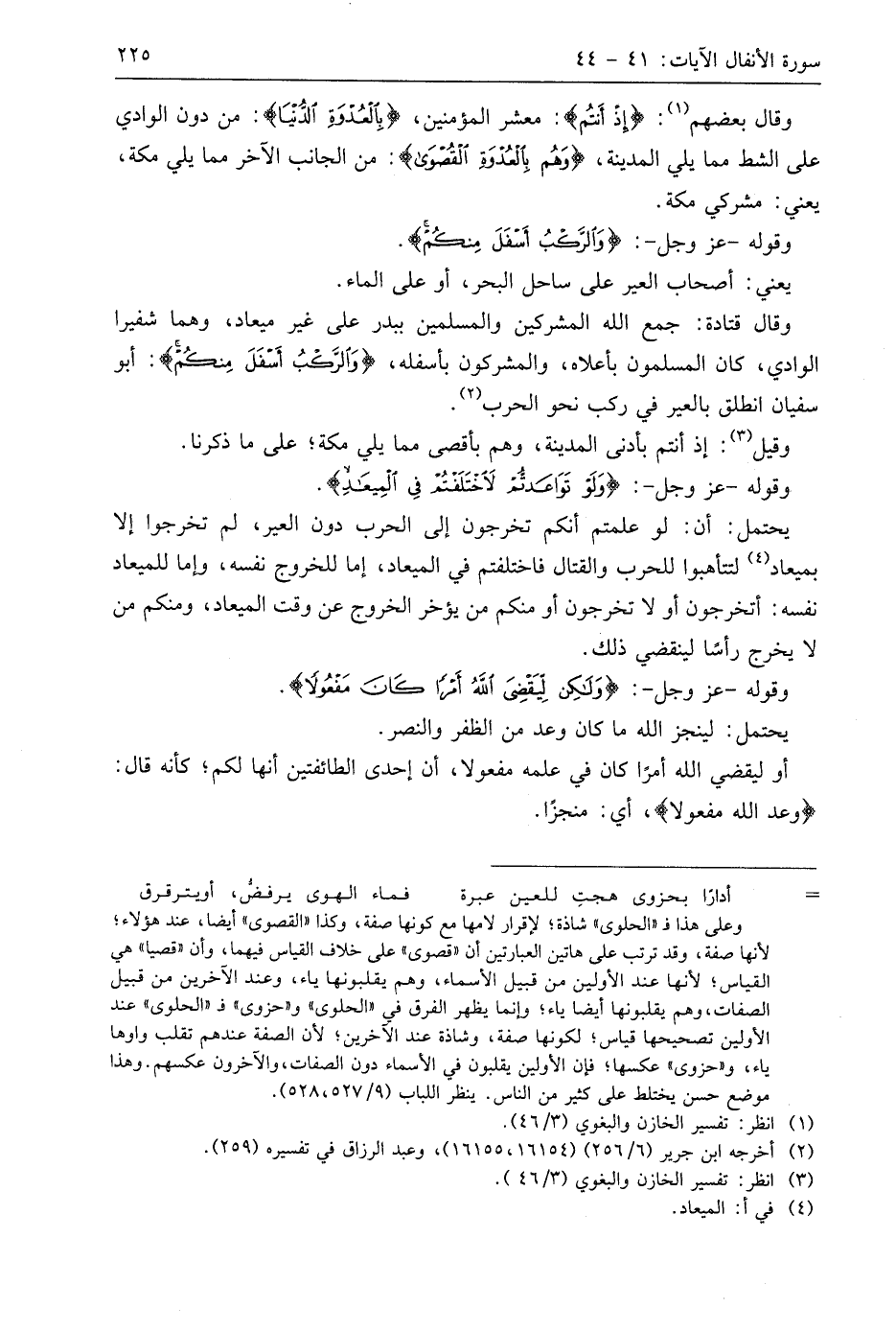 وقَالَ بَعْضُهُمْ: (إِذْ أَنْتُمْ): معشر المؤمنين، (بِالْعُدْوَةِ الدُّنْيَا): من دون الوادي على الشط مما يلي المدينة، (وَهُمْ بِالْعُدْوَةِ الْقُصْوَى): من الجانب الآخر مما يلي مكة، يعني: مشركي مكة.