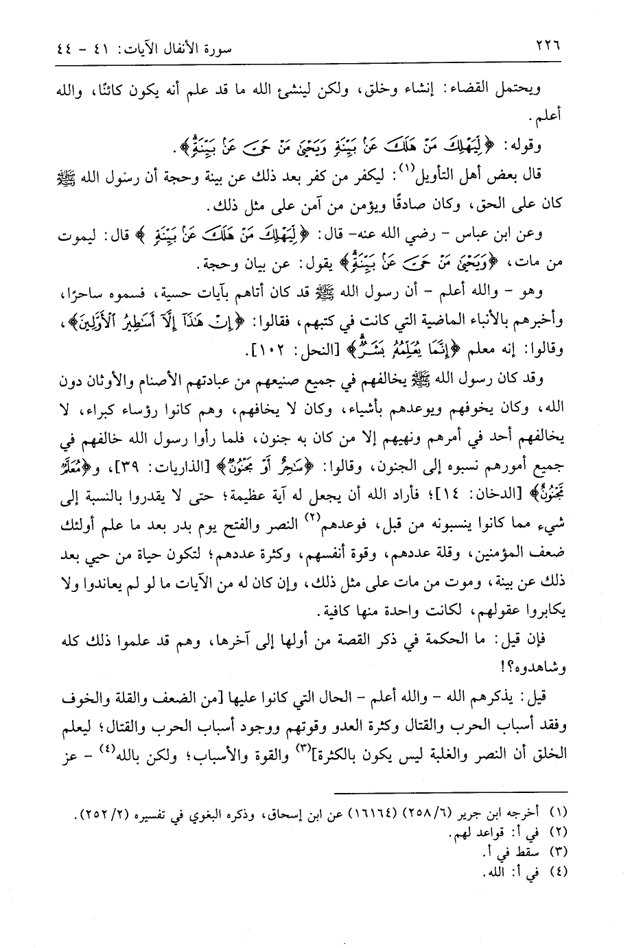 وعن ابن عَبَّاسٍ - رَضِيَ اللَّهُ عَنْهُ - قال: (لِيَهْلِكَ مَنْ هَلَكَ عَنْ بَيِّنَةٍ) قال: ليموت من مات، (وَيَحْيَى مَنْ حَيَّ عَنْ بَيِّنَةٍ) يقول: عن بيان وحجة.