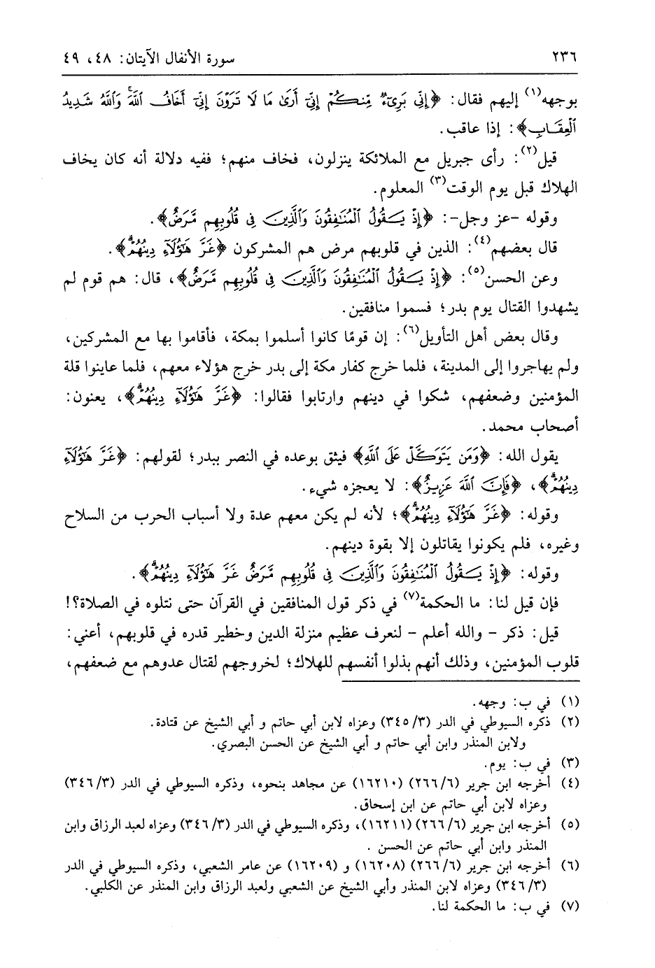 وقوله - عَزَّ وَجَلَّ -: (إِذْ يَقُولُ الْمُنَافِقُونَ وَالَّذِينَ فِي قُلُوبِهِمْ مَرَضٌ غَرَّ هَؤُلَاءِ دِينُهُمْ وَمَنْ يَتَوَكَّلْ عَلَى اللَّهِ فَإِنَّ اللَّهَ عَزِيزٌ حَكِيمٌ (49)