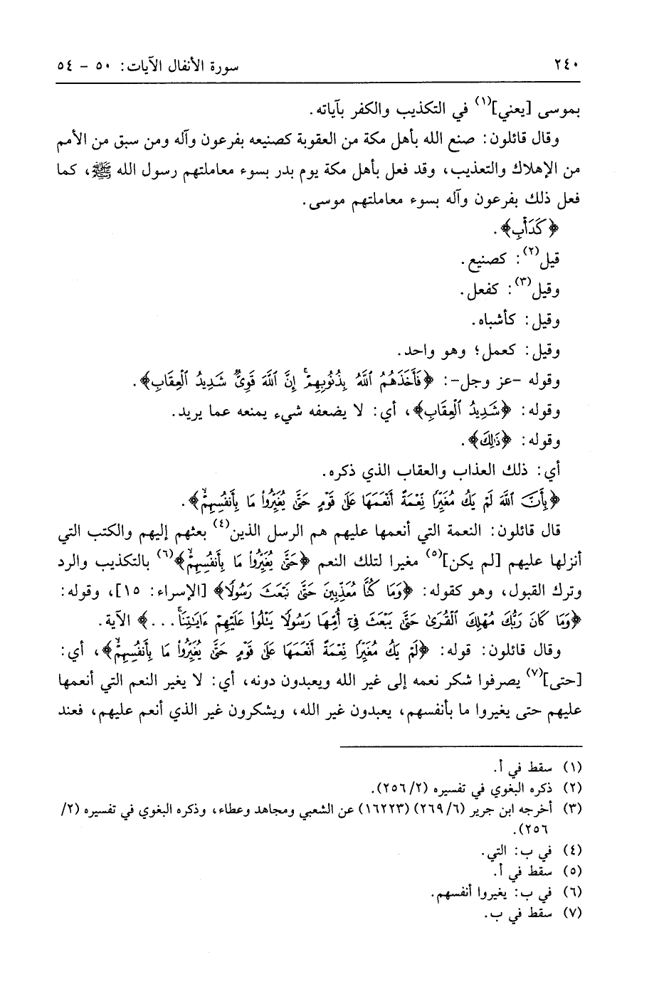 وقال قائلون: صنع اللَّه بأهل مكة من العقوبة كصنيعه بفرعون وآله ومن سبق من الأمم من الإهلاك والتعذيب، وقد فعل بأهل مكة يوم بدر بسوء معاملتهم رسول اللَّه - صَلَّى اللَّهُ عَلَيهِ وَسَلَّمَ -، كما فعل ذلك بفرعون وآله بسوء معاملتهم موسى.