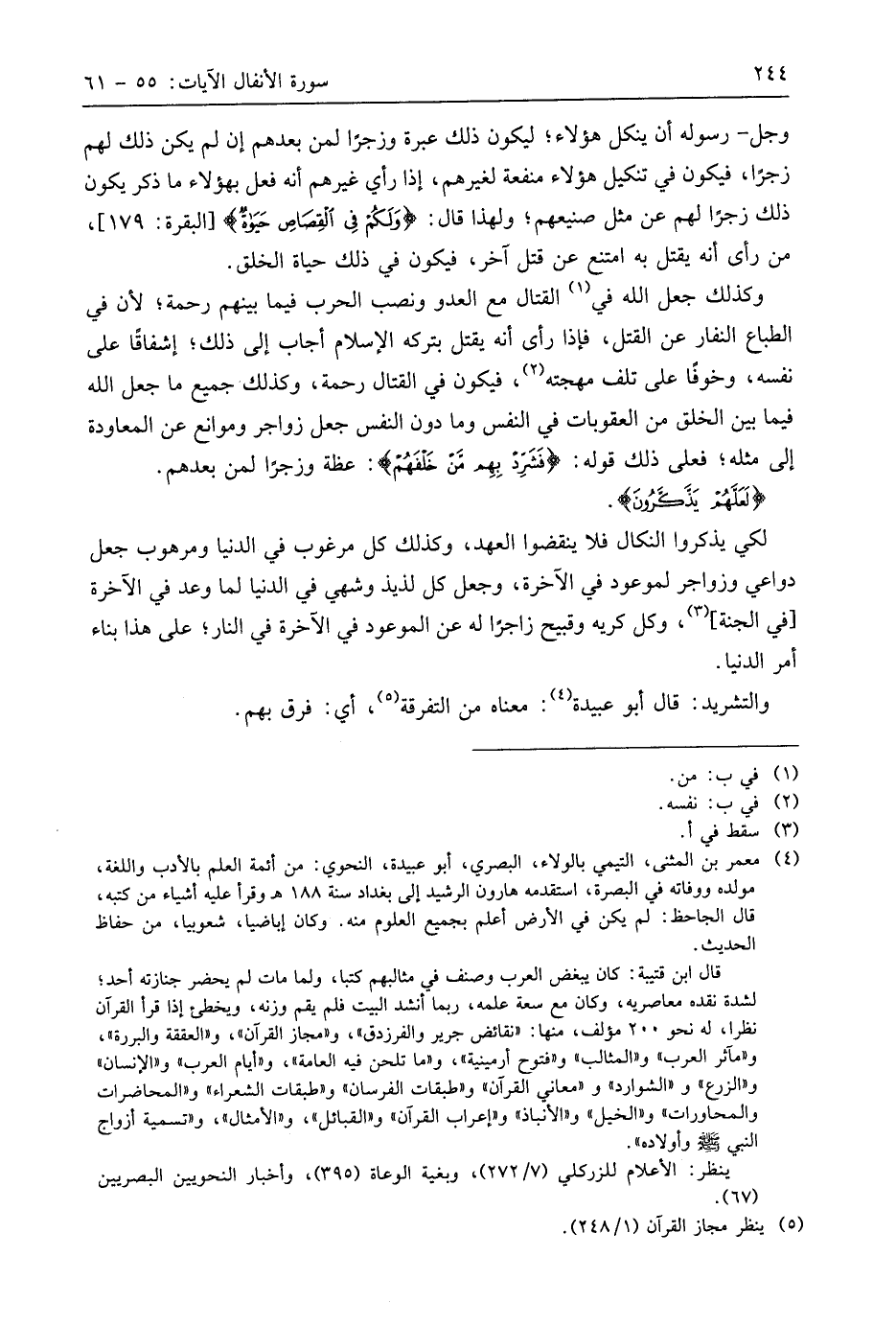 وكذلك جعل اللَّه في القتال مع العدو ونصب الحرب فيما بينهم رحمة؛ لأن في الطباع النفار عن القتل، فإذا رأى أنه يقتل بتركه الإسلام أجاب إلى ذلك؛ إشفاقًا على نفسه، وخوفًا على تلف مهجته، فيكون في القتال رحمة، وكذلك جميع ما جعل الله فيما بين الخلق من العقوبات في النفس وما دون النفس جعل زواجر وموانع عن المعاودة إلى مثله؛ فعلى ذلك قوله: (فَشَرِّدْ بِهِمْ مَنْ خَلْفَهُمْ): عظة وزجرًا لمن بعدهم.