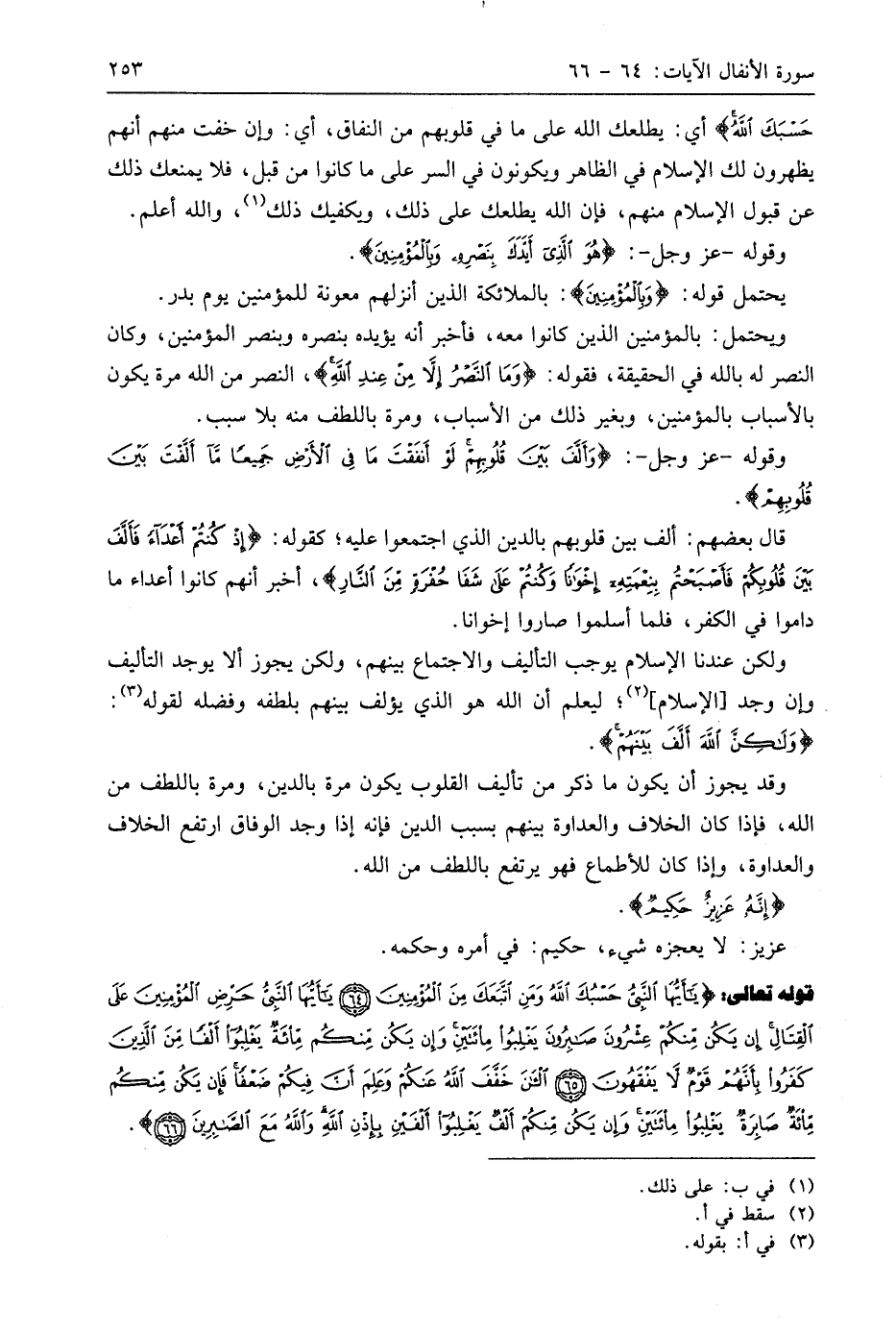 قوله تعالى: (يَا أَيُّهَا النَّبِيُّ حَسْبُكَ اللَّهُ وَمَنِ اتَّبَعَكَ مِنَ الْمُؤْمِنِينَ (64) يَا أَيُّهَا النَّبِيُّ حَرِّضِ الْمُؤْمِنِينَ عَلَى الْقِتَالِ إِنْ يَكُنْ مِنْكُمْ عِشْرُونَ صَابِرُونَ يَغْلِبُوا مِائَتَيْنِ وَإِنْ يَكُنْ مِنْكُمْ مِائَةٌ يَغْلِبُوا أَلْفًا مِنَ الَّذِينَ كَفَرُوا بِأَنَّهُمْ قَوْمٌ لَا يَفْقَهُونَ (65) الْآنَ خَفَّفَ اللَّهُ عَنْكُمْ وَعَلِمَ أَنَّ فِيكُمْ ضَعْفًا فَإِنْ يَكُنْ مِنْكُمْ مِائَةٌ صَابِرَةٌ يَغْلِبُوا مِائَتَيْنِ وَإِنْ يَكُنْ مِنْكُمْ أَلْفٌ يَغْلِبُوا أَلْفَيْنِ بِإِذْنِ اللَّهِ وَاللَّهُ مَعَ الصَّابِرِينَ (66)