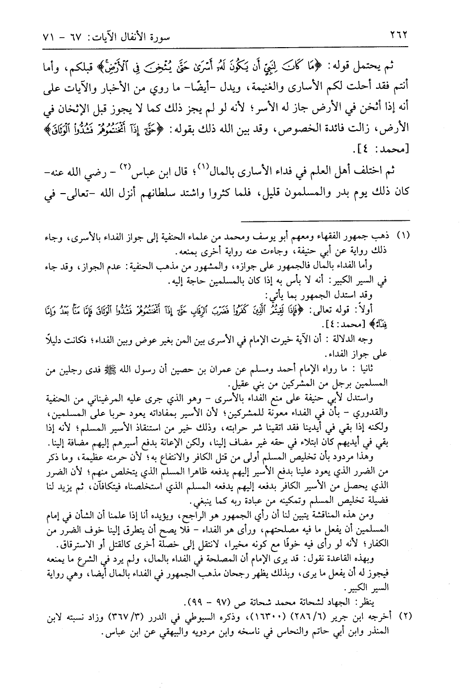 ثم اختلف أهل العلم في فداء الأسارى بالمال؛ قال ابن عَبَّاسٍ - رَضِيَ اللَّهُ عَنْهُ - كان ذلك يوم بدر والمسلمون قليل، فلما كثروا واشتد سلطانهم أنزل اللَّه - تعالى - في