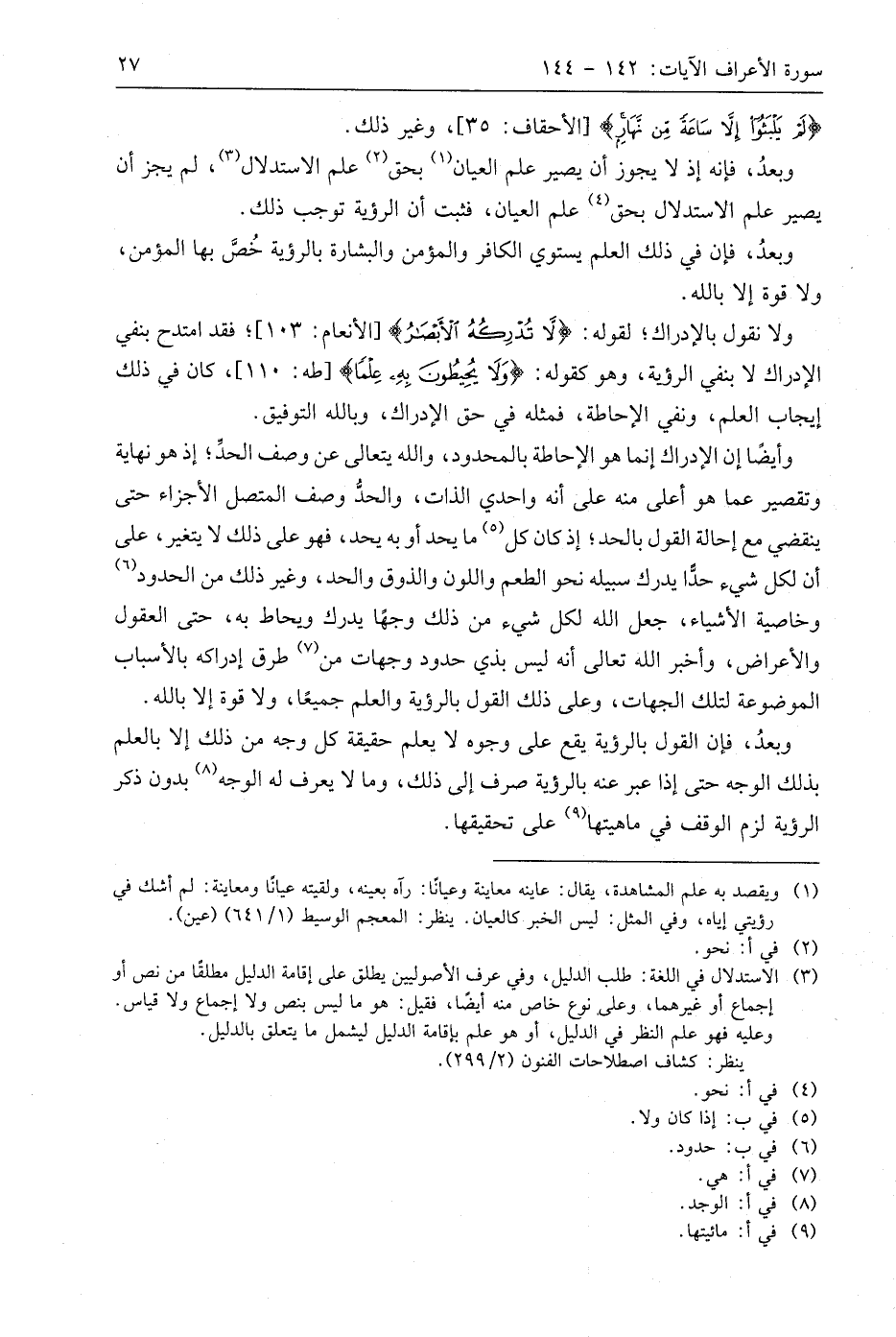 وأيضًا إن الإدراك إنما هو الإحاطة بالمحدود، واللَّه يتعالى عن وصف الحدِّ؛ إذ هو نهاية وتقصير عما هو أعلى منه على أنه واحدي الذات، والحدُّ وصف المتصل الأجزاء حتى ينقضي مع إحالة القول بالحد؛ إذ كان كل ما يحد أو به يحد، فهو على ذلك لا يتغير، على أن لكل شيء حدّا يدرك سبيله نحو الطعم واللون والذوق والحد، وغير ذلك من الحدود وخاصية الأشياء، جعل اللَّه لكل شيء من ذلك وجهًا يدرك ويحاط به، حتى العقول والأعراض، وأخبر اللَّه تعالى أنه ليس بذي حدود وجهات من طرق إدراكه بالأسباب الموضوعة لتلك الجهات، وعلى ذلك القول بالرؤية والعلم جميعًا، ولا قوة إلا باللَّه.