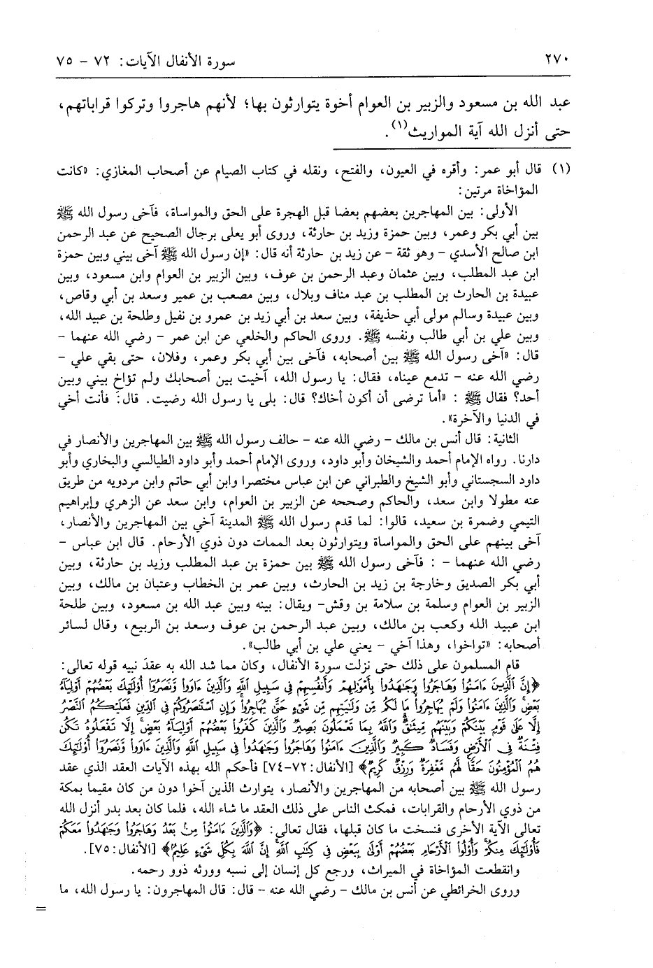 عبد اللَّه بن مسعود والزبير بن العوام أخوة يتوارثون بها؛ لأنهم هاجروا وتركوا قراباتهم، حتى أنزل اللَّه آية المواريث.