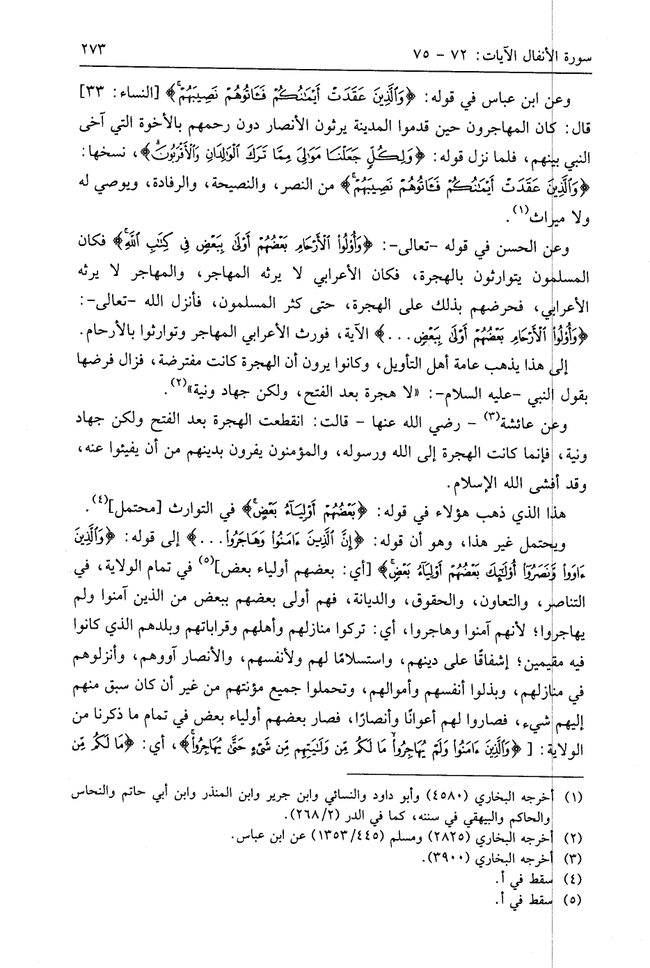 المسلطون يتوارثون بالهجرة، فكان الأعرابي لا يرثه المهاجر، والمهاجر لا يرثه الأعرابي، فحرضهم بذلك على الهجرة، حتى كثر المسلمون، فأنزل اللَّه - تعالى -: (وَأُولُو الْأَرْحَامِ بَعْضُهُمْ أَوْلَى بِبَعْضٍ. . .) الآية، فورث الأعرابي المهاجر وتوارثوا بالأرحام. إلى هذا يذهب عامة أهل التأويل، وكانوا يرون أن الهجرة كانت مفترضة، فزال فرضها بقول النبي - عليه السلام -: " لا هجرة بعد الفتح، ولكن جهاد ونية ".