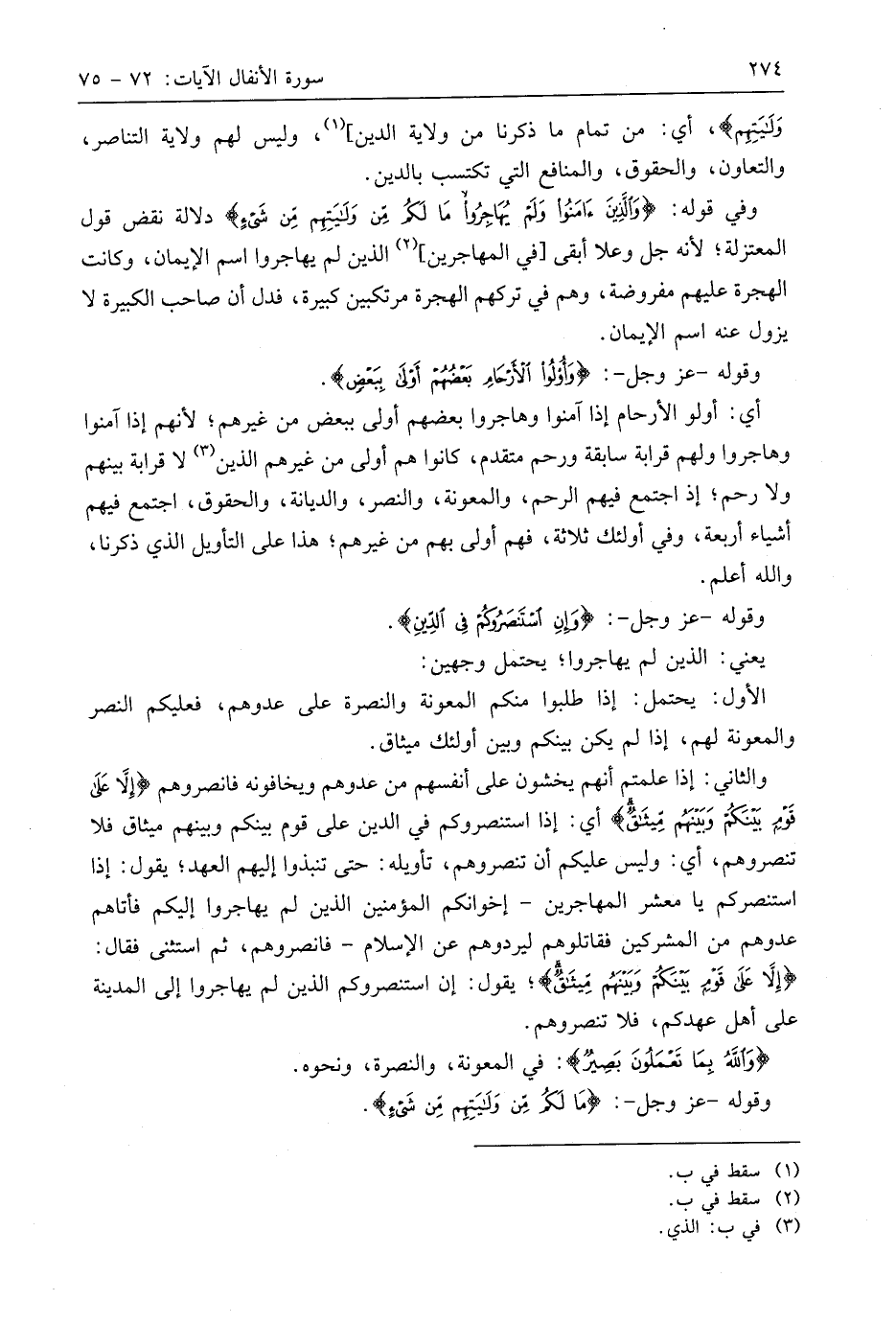 وفي قوله: (وَالَّذِينَ آمَنُوا وَلَمْ يُهَاجِرُوا مَا لَكُمْ مِنْ وَلَايَتِهِمْ مِنْ شَيْءٍ حَتَّى يُهَاجِرُوا) دلالة نقض قول المعتزلة؛ لأنه جل وعلا أبقى في المهاجرين الذين لم يهاجروا اسم الإيمان، وكانت الهجرة عليهم مفروضة، وهم في تركهم الهجرة مرتكبين كبيرة، فدل أن صاحب الكبيرة لا يزول عنه اسم الإيمان.