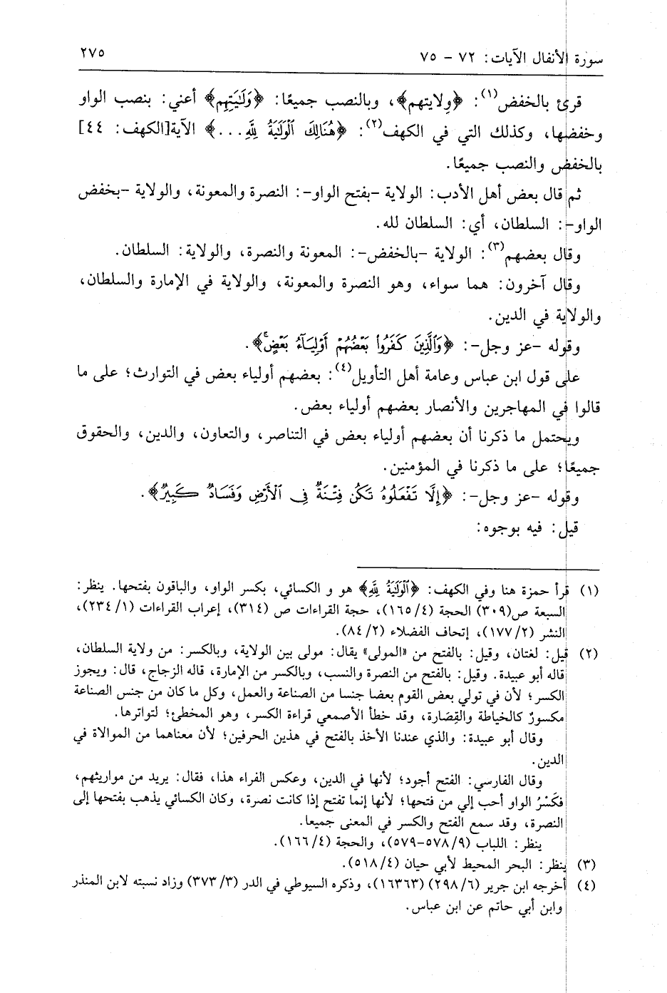 قرئ بالخفض: (وِلَايَتِهِمْ)، وبالنصب جميعًا: (وَلَايَتِهِمْ) أعني: بنصب الواو وخفضها، وكذلك التي في الكهف: (هُنَالِكَ الْوَلَايَةُ لِلَّهِ. . .) الآية. بالخفض والنصب جميعًا.