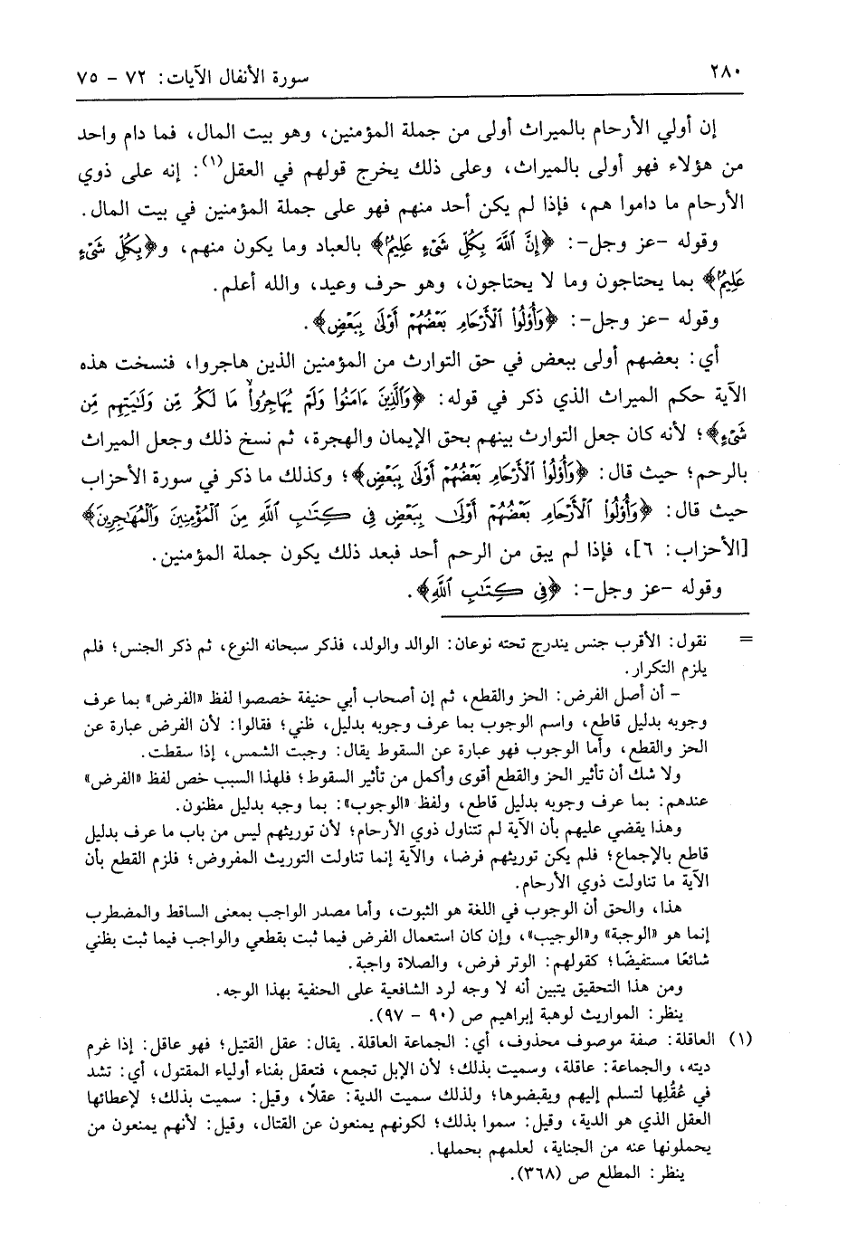 وقوله - عَزَّ وَجَلَّ -: (وَأُولُو الْأَرْحَامِ بَعْضُهُمْ أَوْلَى بِبَعْضٍ).