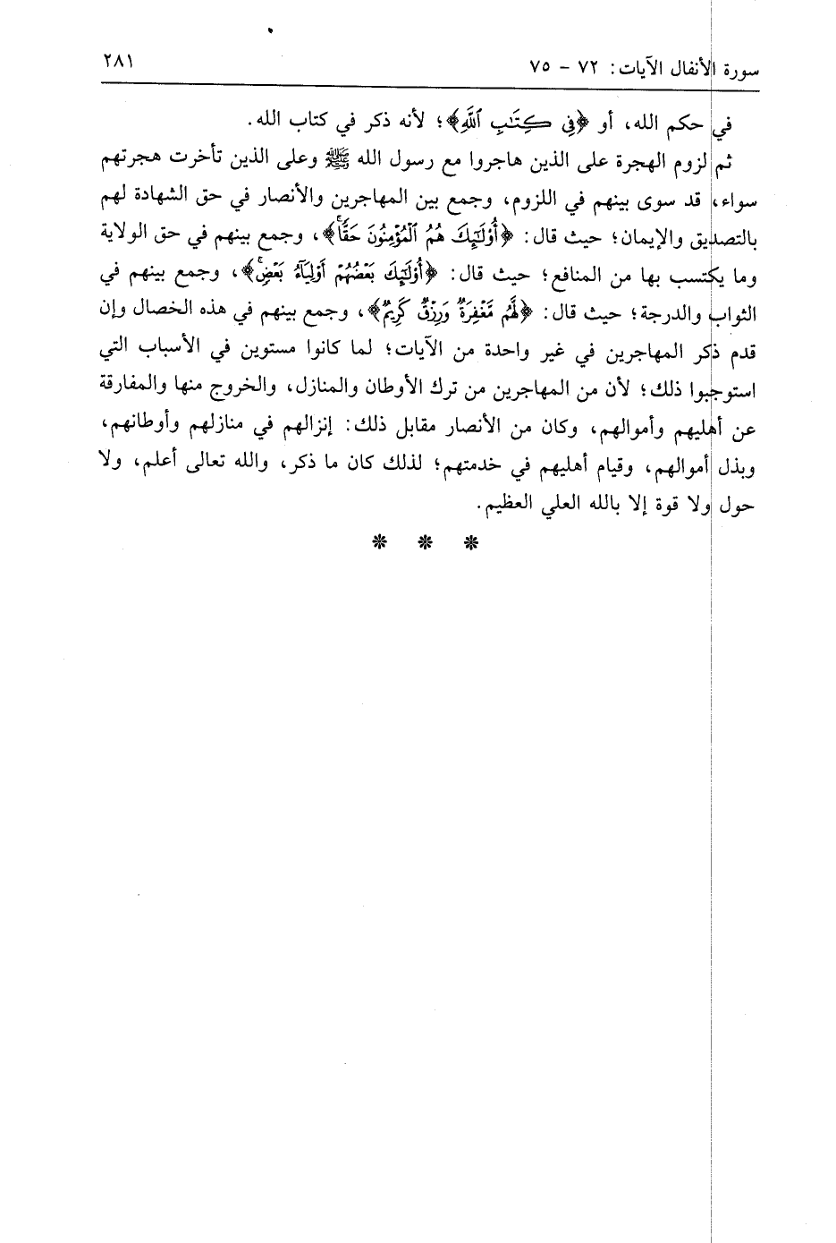 ثم لزوم الهجرة على الذين هاجروا مع رسول اللَّه - صَلَّى اللَّهُ عَلَيهِ وَسَلَّمَ - وعلى الذين تأخرت هجرتهم سواء، قد سوى بينهم في اللزوم، وجمع بين المهاجرين والأنصار في حق الشهادة لهم بالتصديق والإيمان؛ حيث قال: (أُولَئِكَ هُمُ الْمُؤنِوُنَ حَقأ)، وجمع بينهم في حق الولاية وما يكتسب بها من المنافع؛ حيث قال: (أُولَئِكَ هُمُ الْمُؤْمِنُونَ حَقًّا)، وجمع بينهم في الثواب والدرجة؛ حيث قال: (لَهُمْ مَغْفِرَةٌ وَرِزْقٌ كَرِيمٌ)، وجمع بينهم في هذه الخصال وإن قدم ذكر المهاجرين في غير واحدة من الآيات؛ لما كانوا مستوين في الأسباب التي استوجبوا ذلك؛ لأن من المهاجرين من ترك الأوطان والمنازل، والخروج منها والمفارقة عن أهليهم وأموالهم، وكان من الأنصار مقابل ذلك: إنزالهم في منازلهم وأوطانهم، وبذل أموالهم، وقيام أهليهم في خدمتهم؛ لذلك كان ما ذكر، واللَّه تعالى أعلم، ولا حول ولا قوة إلا باللَّه العلي العظيم.