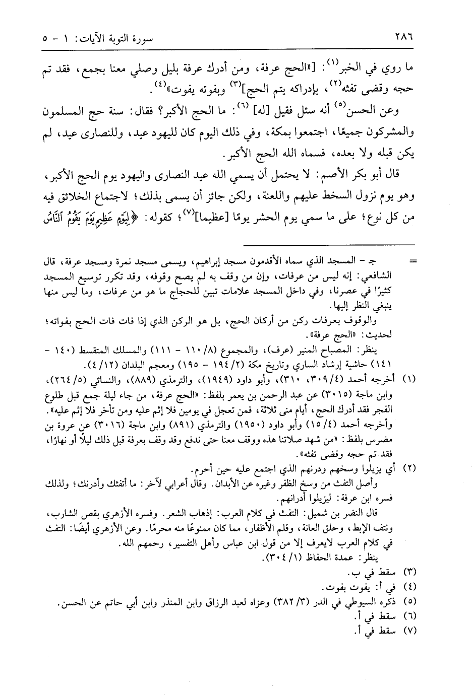 وعن الحسن أنه سئل فقيل له: ما الحج الأكبر؟ فقال: سنة حج المسلمون والمشركون جميعًا، اجتمعوا بمكة، وفي ذلك اليوم كان لليهود عيد، وللنصارى عيد، لم يكن قبله ولا بعده، فسماه اللَّه الحج الأكبر.