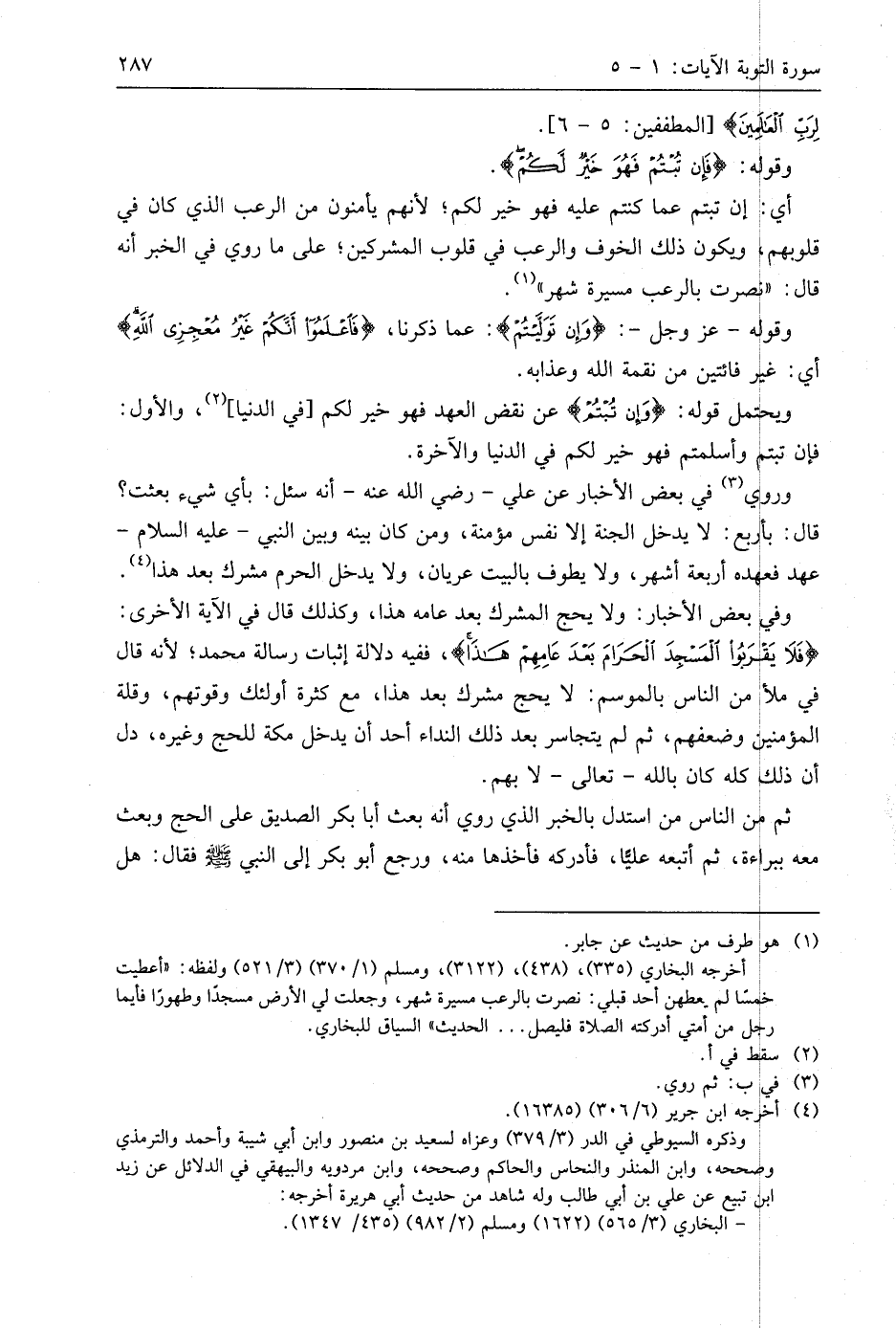 وروي في بعض الأخبار عن علي - رَضِيَ اللَّهُ عَنْهُ - أنه سئل: بأي شيء بعثت؟ قال: بأربع: لا يدخل الجنة إلا نفس مؤمنة، ومن كان بينه وبين النبي - عليه السلام - عهد فعهده أربعة أشهر، ولا يطوف بالبيت عريان، ولا يدخل الحرم مشرك بعد هذا.