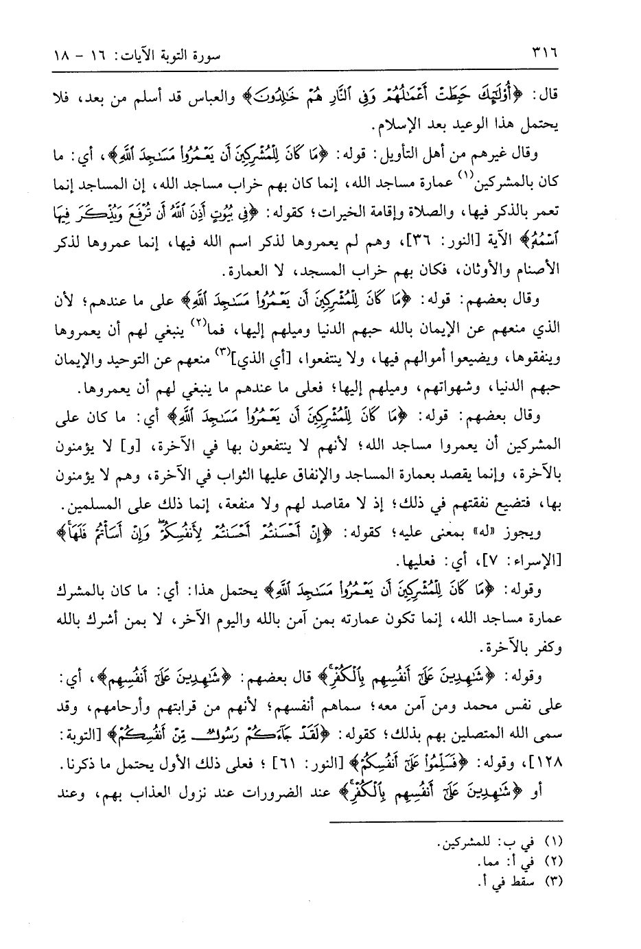 وقَالَ بَعْضُهُمْ: قوله: (مَا كَانَ لِلْمُشْرِكِينَ أَنْ يَعْمُرُوا مَسَاجِدَ اللَّهِ) على ما عندهم؛ لأن الذي منعهم عن الإيمان باللَّه حبهم الدنيا وميلهم إليها، فما ينبغي لهم أن يعمروها وينفقوها، ويضيعوا أموالهم فيها، ولا ينتفعوا، أي الذي منعهم عن التوحيد والإيمان حبهم الدنيا، وشهواتهم، وميلهم إليها؛ فعلى ما عندهم ما ينبغي لهم أن يعمروها.