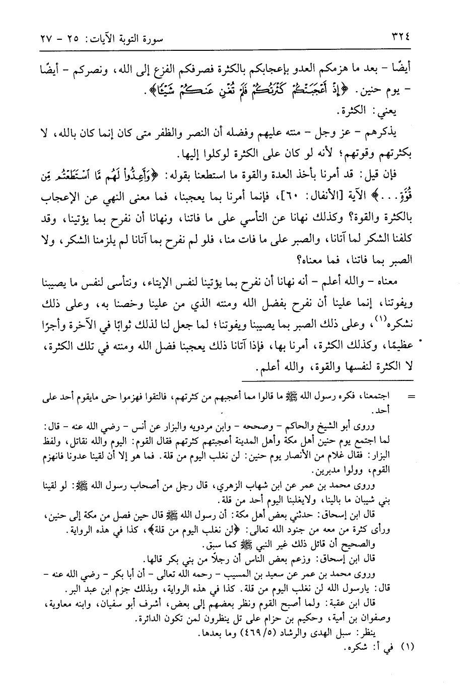 أيضًا - بعد ما هزمكم العدو بإعجابكم بالكثرة فصرفكم الفزع إلى اللَّه، ونصركم - أيضًا - يوم حنين. (إِذْ أَعْجَبَتْكُمْ كَثْرَتُكُمْ فَلَمْ تُغْنِ عَنْكُمْ شَيْئًا).