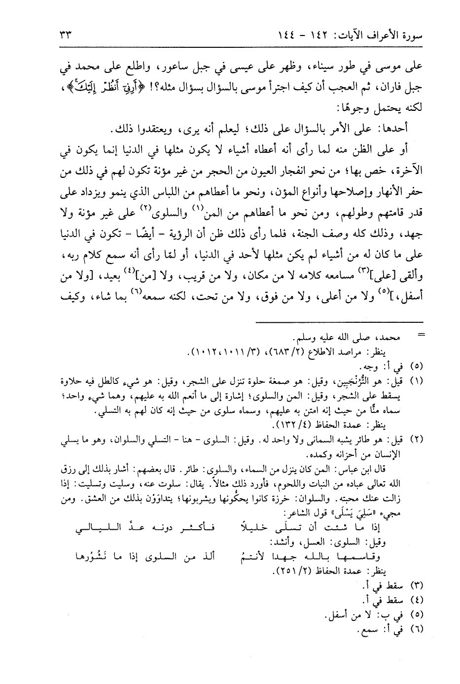 أو على الظن منه لما رأى أنه أعطاه أشياء لا يكون مثلها في الدنيا إنما يكون في الآخرة، خص بها؛ من نحو انفجار العيون من الحجر من غير مؤنة تكون لهم في ذلك من حفر الأنهار وإصلاحها وأنواع المؤن، ونحو ما أعطاهم من اللباس الذي ينمو ويزداد على قدر قامتهم وطولهم، ومن نحو ما أعطاهم من المن والسلوى على غير مؤنة ولا جهد، وذلك كله وصف الجنة، فلما رأى ذلك ظن أن الرؤية -أيضًا- تكون في الدنيا على ما كان له من أشياء لم يكن مثلها لأحد في الدنيا، أو لما رأى أنه سمع كلام ربه، وألقى على مسامعه كلامه لا من مكان، ولا من قريب، ولا من بعيد، ولا من أسفل، ولا من أعلى، ولا من فوق، ولا من تحت، لكنه سمعه بما شاء، وكيف