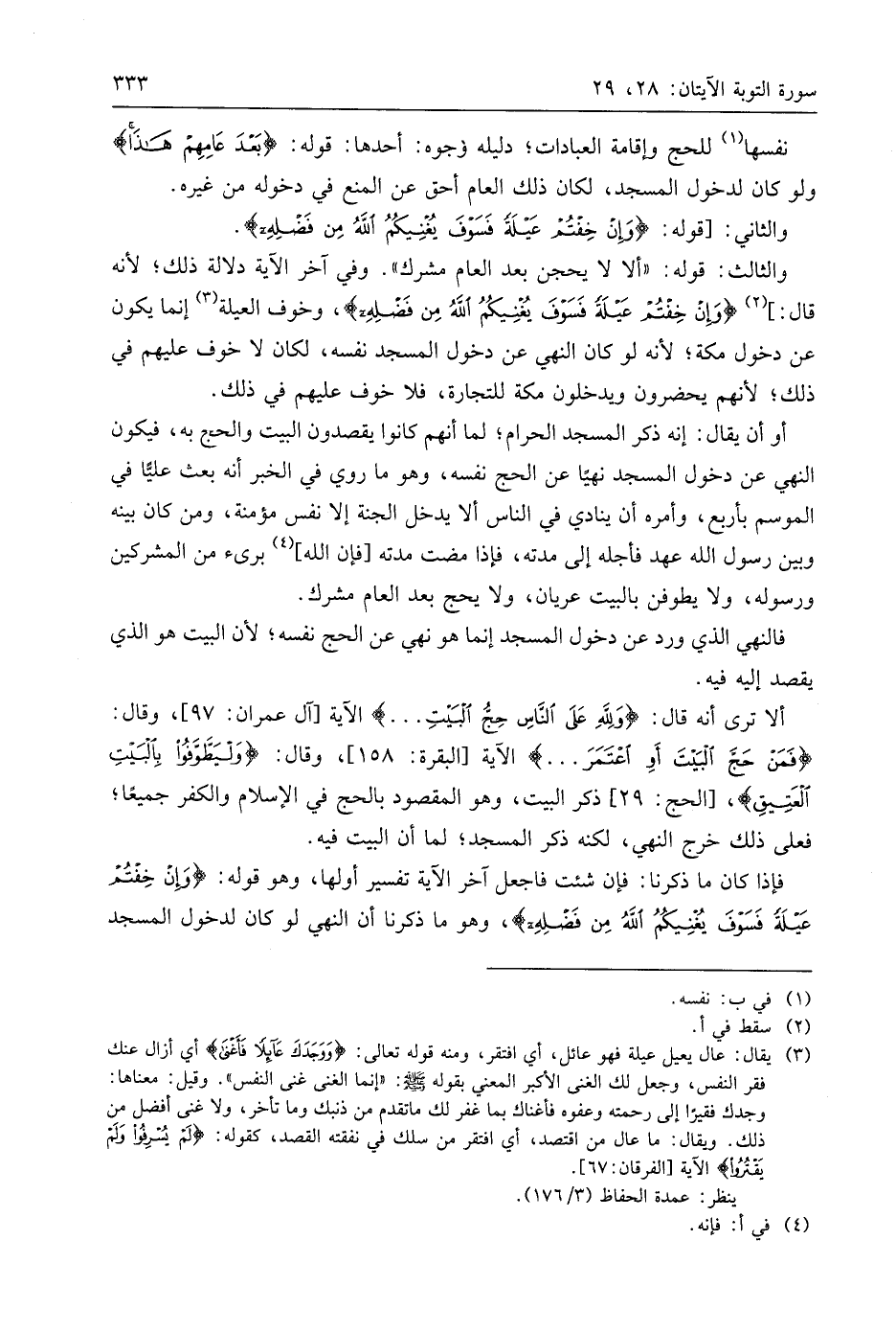 فإذا كان ما ذكرنا: فإن شئت فاجعل آخر الآية تفسير أولها، وهو قوله: (وَإِنْ خِفْتُمْ عَيْلَةً فَسَوْفَ يُغْنِيكُمُ اللَّهُ مِنْ فَضْلِهِ)، وهو ما ذكرنا أن النهي لو كان لدخول المسجد