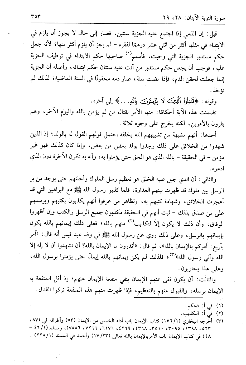 تضمنت هذه الآية أحكامًا: منها الأمر بقتال من لم يؤمن باللَّه واليوم الآخر، وهم يقرون بالأمرين، لكنه يخرج على وجوه ثلاثة: