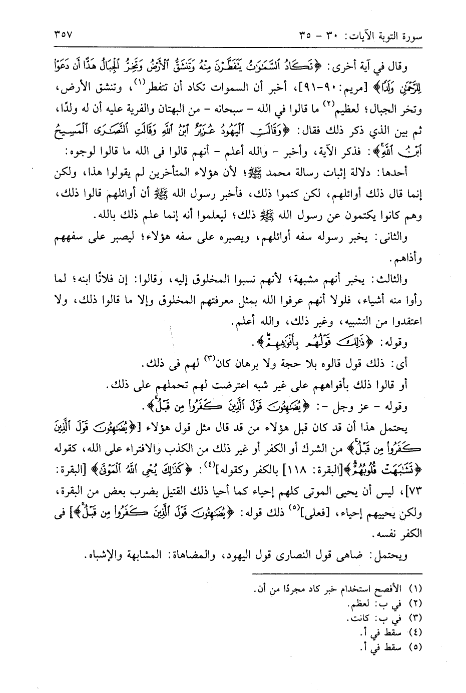 وقال في آية أخرى: (تَكَادُ السَّمَاوَاتُ يَتَفَطَّرْنَ مِنْهُ وَتَنْشَقُّ الْأَرْضُ وَتَخِرُّ الْجِبَالُ هَدًّا (90) أَنْ دَعَوْا لِلرَّحْمَنِ وَلَدًا (91)، أخبر أن السماوات تكاد أن تتفطر، وتنشق الأرض، وتخر الجبال؛ لعظيم ما قالوا في اللَّه - سبحانه - من البهتان والفرية عليه أن له ولدًا، ثم بين الذي ذكر ذلك فقال: (وَقَالَتِ الْيَهُودُ عُزَيْرٌ ابْنُ اللَّهِ وَقَالَتِ النَّصَارَى الْمَسِيحُ ابْنُ اللَّهِ): فذكر الآية، وأخبر - واللَّه أعلم - أنهم قالوا في اللَّه ما قالوا لوجوه: