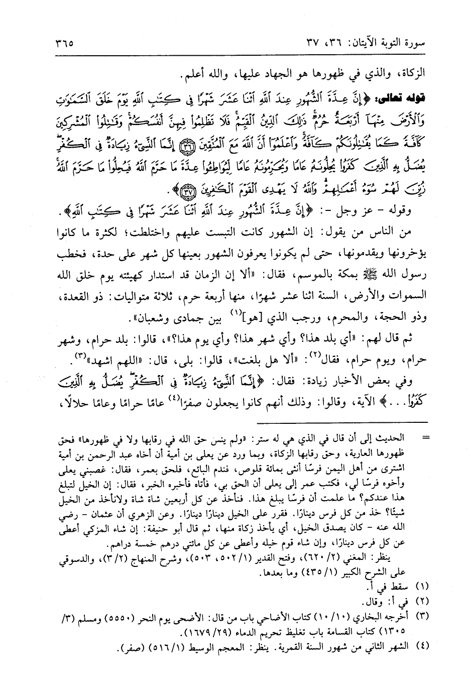 قوله تعالى: (إِنَّ عِدَّةَ الشُّهُورِ عِنْدَ اللَّهِ اثْنَا عَشَرَ شَهْرًا فِي كِتَابِ اللَّهِ يَوْمَ خَلَقَ السَّمَاوَاتِ وَالْأَرْضَ مِنْهَا أَرْبَعَةٌ حُرُمٌ ذَلِكَ الدِّينُ الْقَيِّمُ فَلَا تَظْلِمُوا فِيهِنَّ أَنْفُسَكُمْ وَقَاتِلُوا الْمُشْرِكِينَ كَافَّةً كَمَا يُقَاتِلُونَكُمْ كَافَّةً وَاعْلَمُوا أَنَّ اللَّهَ مَعَ الْمُتَّقِينَ (36) إِنَّمَا النَّسِيءُ زِيَادَةٌ فِي الْكُفْرِ يُضَلُّ بِهِ الَّذِينَ كَفَرُوا يُحِلُّونَهُ عَامًا وَيُحَرِّمُونَهُ عَامًا لِيُوَاطِئُوا عِدَّةَ مَا حَرَّمَ اللَّهُ فَيُحِلُّوا مَا حَرَّمَ اللَّهُ زُيِّنَ لَهُمْ سُوءُ أَعْمَالِهِمْ وَاللَّهُ لَا يَهْدِي الْقَوْمَ الْكَافِرِينَ (37)