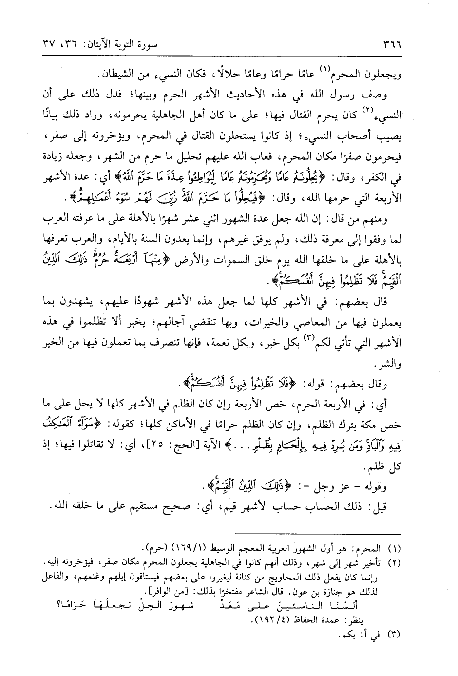 ومنهم من قال: إن اللَّه جعل عدة الشهور اثني عشر شهرًا بالأهلة على ما عرفته العرب لما وفقوا إلى معرفة ذلك، ولم يوفق غيرهم، وإنَّمَا يعدون السنة بالأيام، والعرب تعرفها بالأهلة على ما خلقها اللَّه يوم خلق السماوات والأرض (مِنْهَا أَرْبَعَةٌ حُرُمٌ ذَلِكَ الدِّينُ الْقَيِّمُ فَلَا تَظْلِمُوا فِيهِنَّ أَنْفُسَكُمْ).