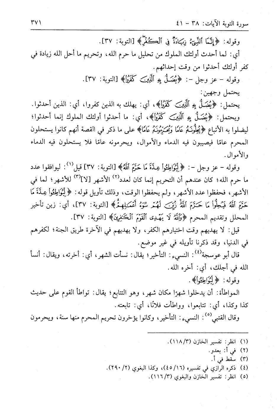وقوله - عَزَّ وَجَلَّ -: (لِيُوَاطِئُوا عِدَّةَ مَا حَرَّمَ اللَّهُ)، قيل: ليوافقوا عدد ما حرم اللَّه؛ كان عندهم أن التحريم إنما كان لعدد الأشهر لا للأشهر؛ لما في الأشهر، فحفظوا عدد الأشهر، ولم يحفظوا الوقت، وذلك تأويل قوله: (لِيُوَاطِئُوا عِدَّةَ مَا حَرَّمَ اللَّهُ فَيُحِلُّوا مَا حَرَّمَ اللَّهُ زُيِّنَ لَهُمْ سُوءُ أَعْمَالِهِمْ) أي: زين تأخير المحلل وتقديم المحرم (وَاللَّهُ لَا يَهْدِي الْقَوْمَ الْكَافِرِينَ).