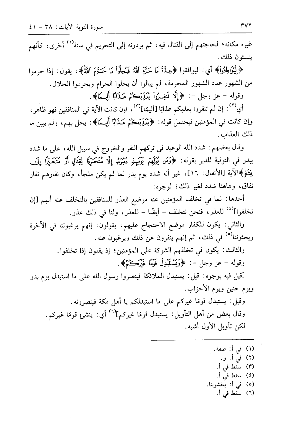 وقَالَ بَعْضُهُمْ: شدد اللَّه الوعيد في تركهم النفر والخروج في سبيل اللَّه، على ما شدد ببدر في التولية للدبر بقوله: (وَمَنْ يُوَلِّهِمْ يَوْمَئِذٍ دُبُرَهُ إِلَّا مُتَحَرِّفًا لِقِتَالٍ أَوْ مُتَحَيِّزًا إِلَى فِئَةٍ) الآية، غير أنه شدد يوم بدر لما لم يكن ملجأ، وكان نفارهم نفار نفاق، وهاهنا شدد لغير ذلك؛ لوجوه: