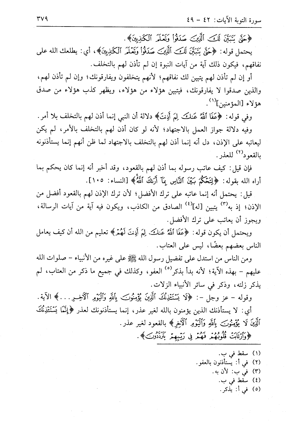 عَفَا اللَّهُ عَنْكَ لِمَ أَذِنْتَ لَهُمْ حَتَّى يَتَبَيَّنَ لَكَ الَّذِينَ صَدَقُوا وَتَعْلَمَ الْكَاذِبِينَ