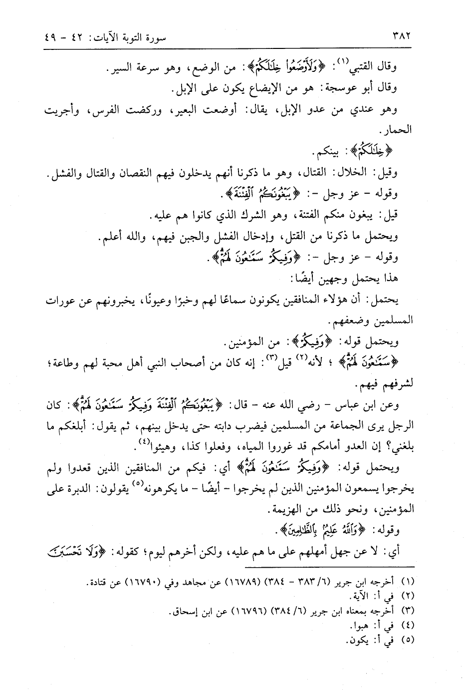 وعن ابن عَبَّاسٍ - رَضِيَ اللَّهُ عَنْهُ - قال: (يَبْغُونَكُمُ الْفِتْنَةَ وَفِيكُمْ سَمَّاعُونَ لَهُمْ): كان الرجل يرى الجماعة من المسلمين فيضرب دابته حتى يدخل بينهم، ثم يقول: أبلغكم ما بلغني؛ إن العدو أمامكم قد غوروا المياه، وفعلوا كذا، وهيئوا.
