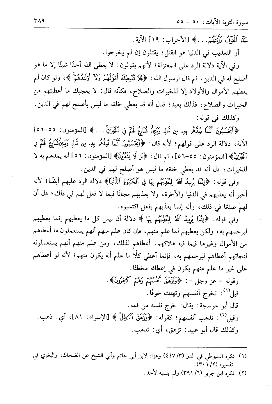 (أَيَحْسَبُونَ أَنَّمَا نُمِدُّهُمْ بِهِ مِنْ مَالٍ وَبَنِينَ (55) نُسَارِعُ لَهُمْ فِي الْخَيْرَاتِ. . .). الآية، دلالة الرد على قولهم؛ لأنه قال: (أَيَحْسَبُونَ أَنَّمَا نُمِدُّهُمْ بِهِ مِنْ مَالٍ وَبَنِينَ (55) نُسَارِعُ لَهُمْ فِي الْخَيْرَاتِ)، ثم قال: (بَلْ لَا يَشْعُرُونَ)، أنه يمدهم به لا للخيرات؛ دل أنه قد يعطي خلقه ما ليس هو أصلح لهم في الدِّين.