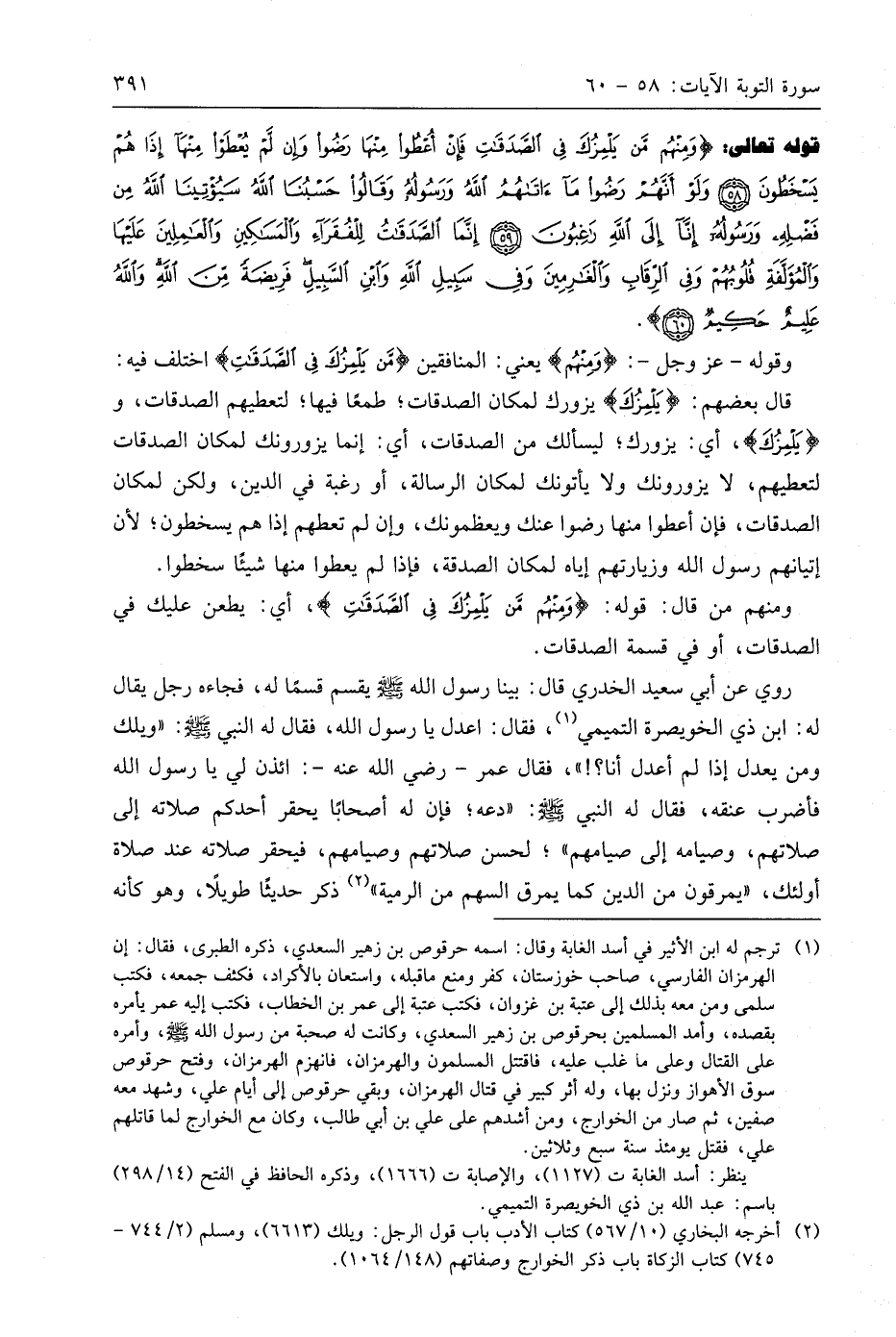 قوله تعالى: (وَمِنْهُمْ مَنْ يَلْمِزُكَ فِي الصَّدَقَاتِ فَإِنْ أُعْطُوا مِنْهَا رَضُوا وَإِنْ لَمْ يُعْطَوْا مِنْهَا إِذَا هُمْ يَسْخَطُونَ (58) وَلَوْ أَنَّهُمْ رَضُوا مَا آتَاهُمُ اللَّهُ وَرَسُولُهُ وَقَالُوا حَسْبُنَا اللَّهُ سَيُؤْتِينَا اللَّهُ مِنْ فَضْلِهِ وَرَسُولُهُ إِنَّا إِلَى اللَّهِ رَاغِبُونَ (59) إِنَّمَا الصَّدَقَاتُ لِلْفُقَرَاءِ وَالْمَسَاكِينِ وَالْعَامِلِينَ عَلَيْهَا وَالْمُؤَلَّفَةِ قُلُوبُهُمْ وَفِي الرِّقَابِ وَالْغَارِمِينَ وَفِي سَبِيلِ اللَّهِ وَابْنِ السَّبِيلِ فَرِيضَةً مِنَ اللَّهِ وَاللَّهُ عَلِيمٌ حَكِيمٌ (60)