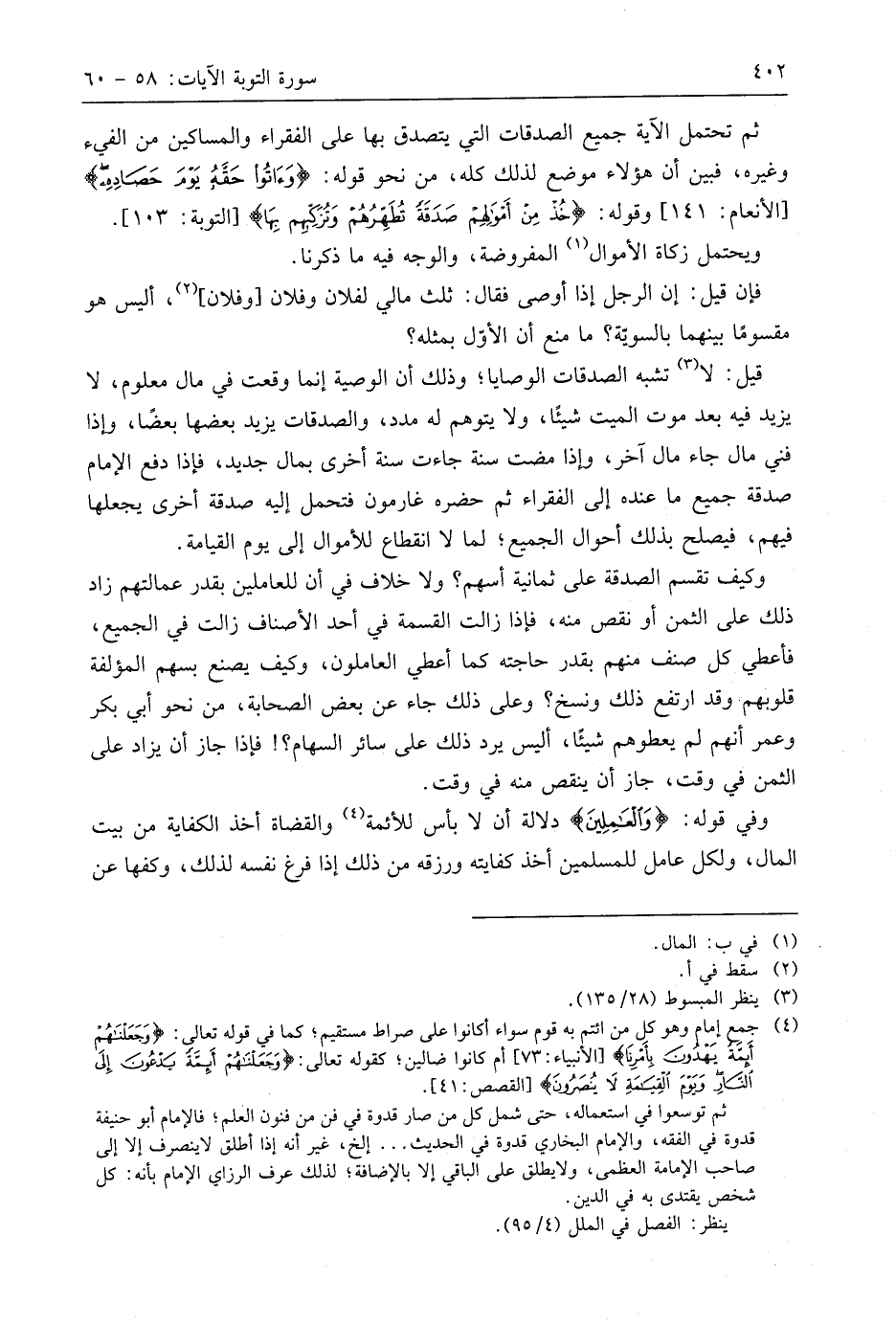 وكيف تقسم الصدقة على ثمانية أسهم؟ ولا خلاف في أن للعاملين بقدر عمالتهم زاد ذلك على الثمن أو نقص منه، فإذا زالت القسمة في أحد الأصناف زالت في الجميع، فأعطي كل صنف منهم بقدر حاجته كما أعطي العاملون، وكيف يصنع بسهم المؤلفة قلوبهم وقد ارتفع ذلك ونسخ؟ وعلى ذلك جاء عن بعض الصحابة، من نحو أبي بكر وعمر أنهم لم يعطوهم شيئًا، أليس يرد ذلك على سائر السهام؟! فإذا جاز أن يزاد على الثمن في وقت، جاز أن ينقص منه في وقت.