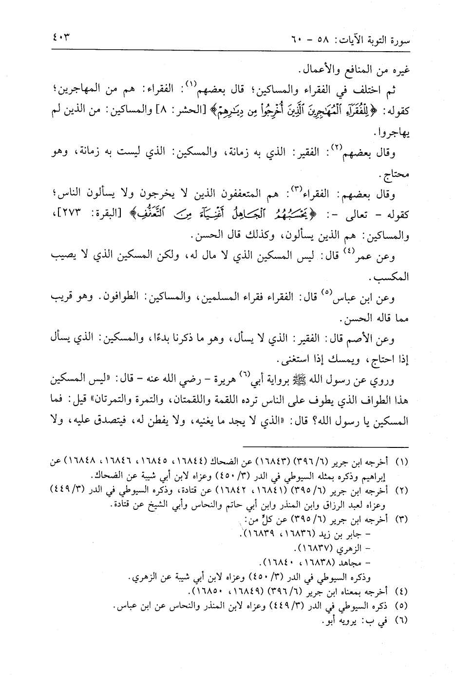 وعن ابن عَبَّاسٍ قال: الفقراء فقراء المسلمين، والمساكين: الطوافون. وهو قريب مما قاله الحسن.