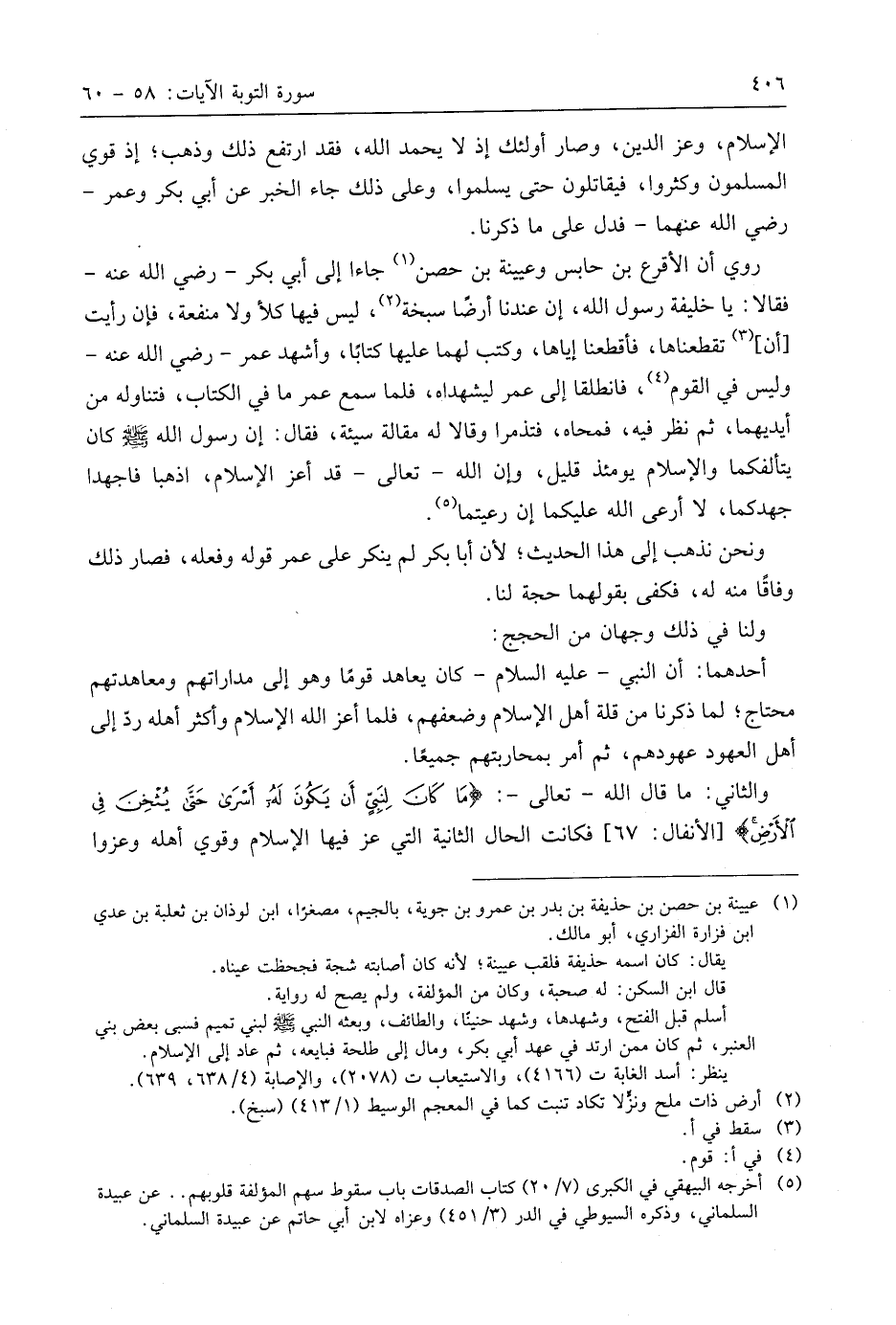 روي أن الأقرع بن حابس وعيينة بن حصن جاءا إلى أبي بكر - رَضِيَ اللَّهُ عَنْهُ - فقالا: يا خليفة رسول اللَّه، إن عندنا أرضًا سبخة، ليس فيها كلأ ولا منفعة، فإن رأيت أن تقطعناها، فأقطعنا إياها، وكتب لهما عليها كتابًا، وأشهد عمر - رَضِيَ اللَّهُ عَنْهُ - وليس في القوم، فانطلقا إلى عمر ليشهداه، فلما سمع عمر ما في الكتاب، فتناوله من أيديهما، ثم نظر فيه، فمحاه، فتذمرا وقالا له مقالة سيئة، فقال: إن رسول اللَّه - صَلَّى اللَّهُ عَلَيهِ وَسَلَّمَ - كان يتألفكما والإسلام يومئذ قليل، وإن اللَّه - تعالى - قد أعز الإسلام، اذهبا فاجهدا