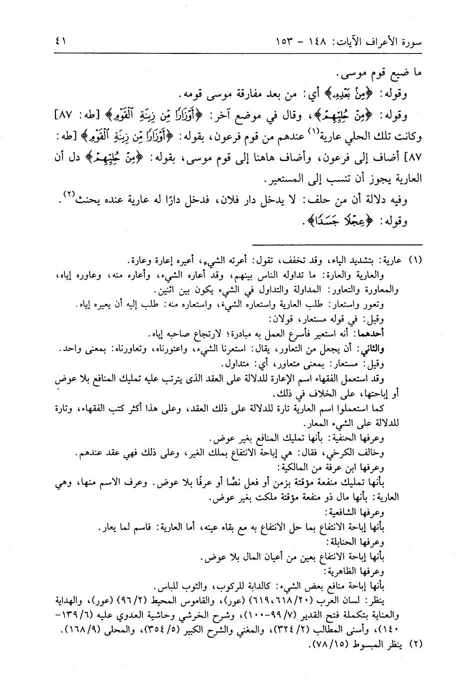 وقوله: (مِنْ حُلِيِّهِمْ)، وقال في موضع آخر: (أَوْزَارًا مِنْ زِينَةِ الْقَوْمِ)، وكانت تلك الحلي عارية عندهم من قوم فرعون، بقوله: (أَوْزَارًا مِنْ زِينَةِ الْقَوْمِ) أضاف إلى فرعون، وأضاف هاهنا إلى قوم موسى، بقوله: (مِنْ حُلِيِّهِمْ) دل أن العارية يجوز أن تنسب إلى المستعير.