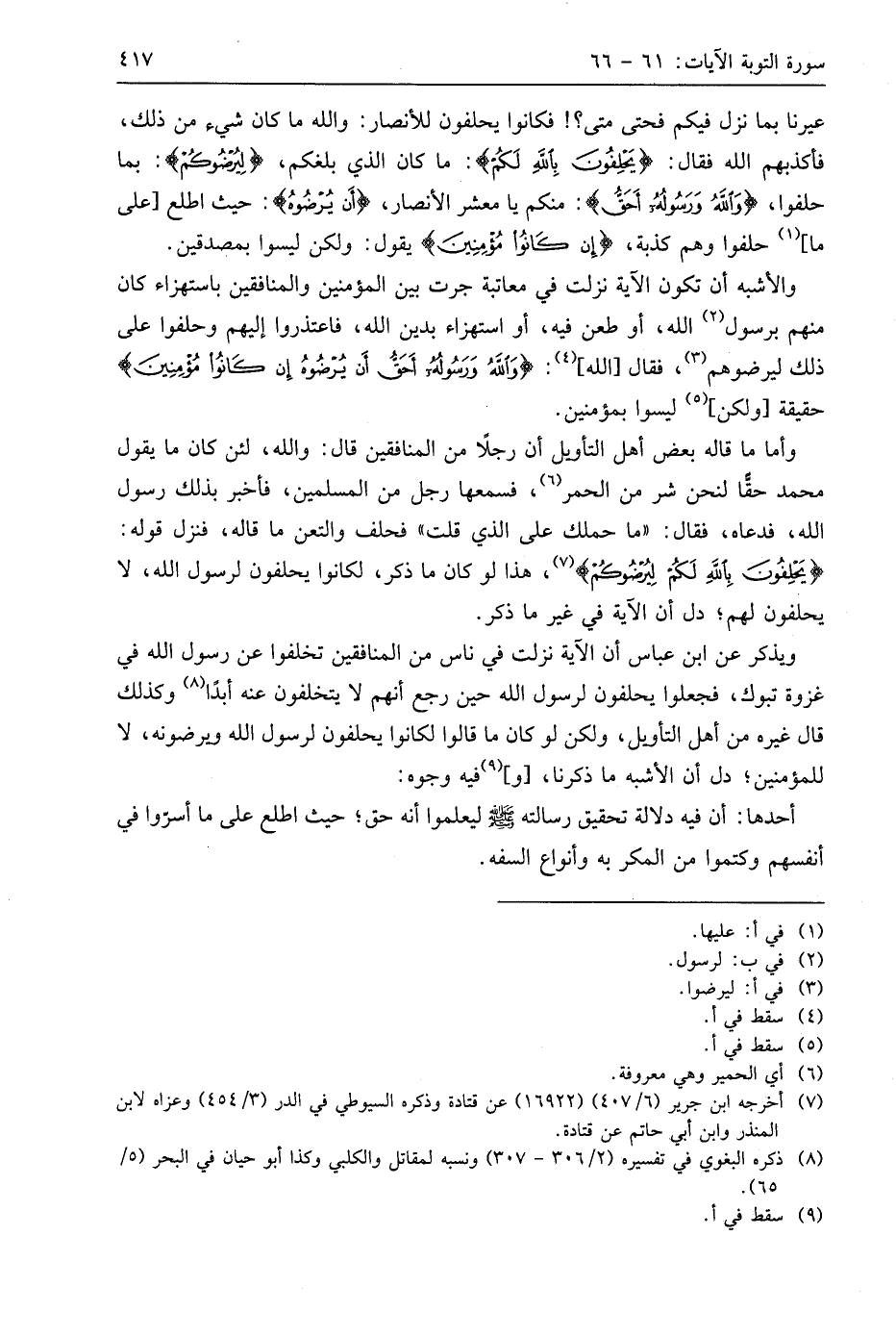 والأشبه أن تكون الآية نزلت في معاتبة جرت بين المؤمنين والمنافقين باستهزاء كان منهم برسول اللَّه، أو طعن فيه، أو استهزاء بدين اللَّه، فاعتذروا إليهم وحلفوا على ذلك ليرضوهم، فقال اللَّه: (وَاللَّهُ وَرَسُولُهُ أَحَقُّ أَنْ يُرْضُوهُ إِنْ كَانُوا مُؤْمِنِينَ) حقيقة ولكن ليسوا بمؤمنين.