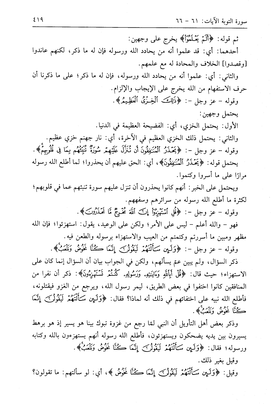 وقوله - عَزَّ وَجَلَّ -: (وَلَئِنْ سَأَلْتَهُمْ لَيَقُولُنَّ إِنَّمَا كُنَّا نَخُوضُ وَنَلْعَبُ قُلْ أَبِاللَّهِ وَآيَاتِهِ وَرَسُولِهِ كُنْتُمْ تَسْتَهْزِئُونَ (65)