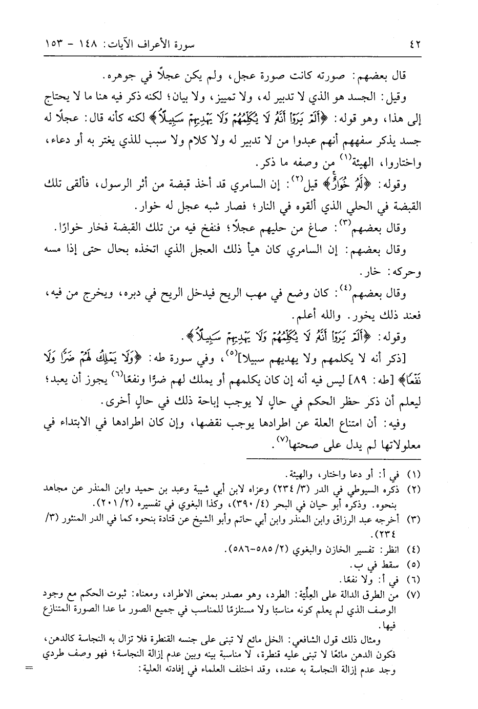 وقيل: الجسد هو الذي لا تدبير له، ولا تمييز، ولا بيان؛ لكنه ذكر فيه هنا ما لا يحتاج إلى هذا، وهو قوله: (أَلَمْ يَرَوْا أَنَّهُ لَا يُكَلِّمُهُمْ وَلَا يَهْدِيهِمْ سَبِيلًا) لكنه كأنه قال: عجلًا له جسد يذكر سفههم أنهم عبدوا من لا تدبير له ولا كلام ولا سبب للذي يغتر به أو دعاء، واختاروا، الهيئة من وصفه ما ذكر.