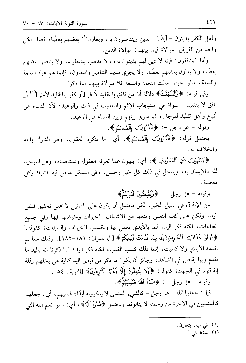 (وَيَنْهَوْنَ عَنِ الْمَعْرُوفِ)، أي: ينهون عما تعرفه العقول وتستحسنه، وهو التوحيد لله والإيمان به، ويدخل في ذلك كل خير وحسن، وفي المنكر يدخل فيه الشرك وكل معصية.