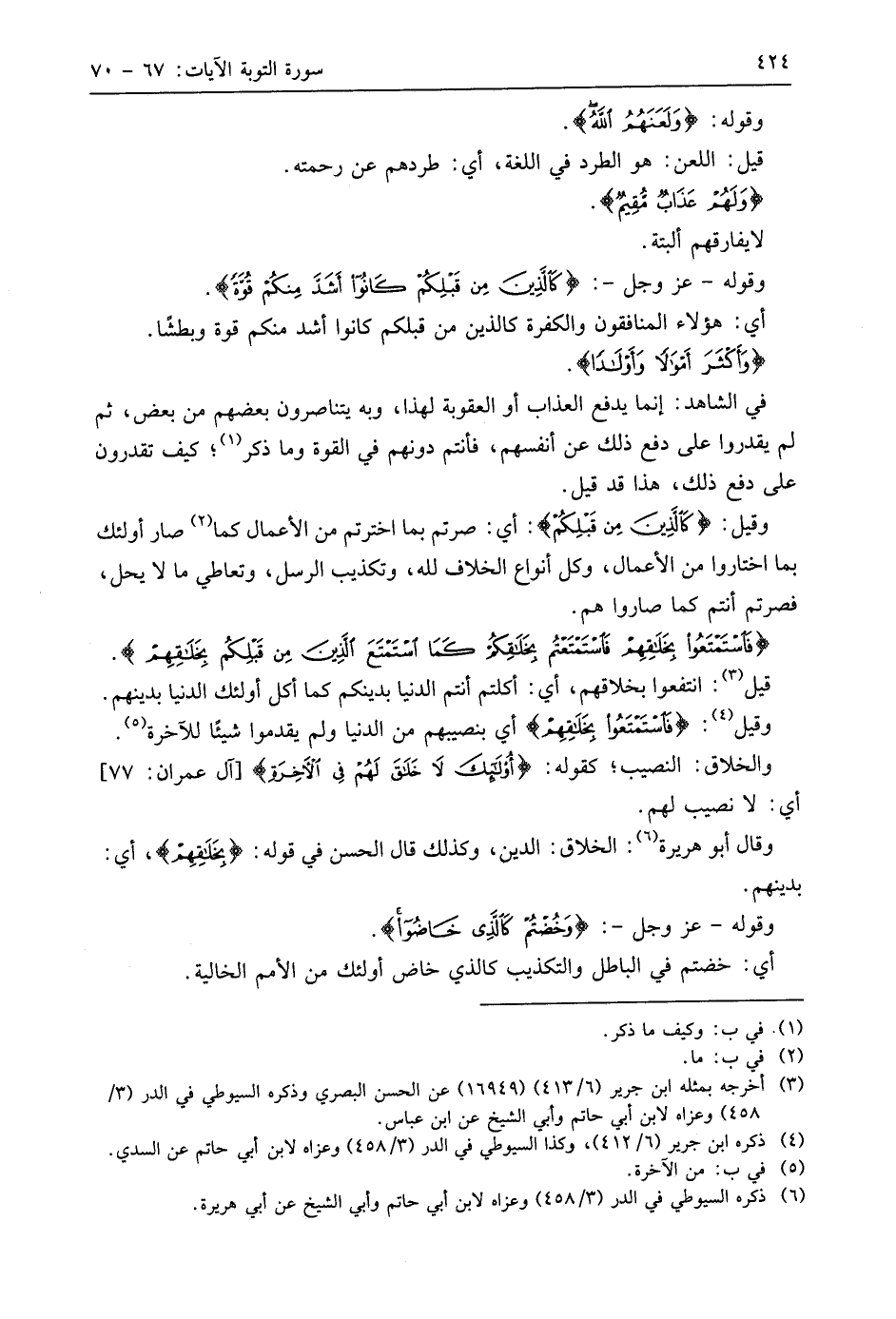 وقوله - عَزَّ وَجَلَّ -: (كَالَّذِينَ مِنْ قَبْلِكُمْ كَانُوا أَشَدَّ مِنْكُمْ قُوَّةً وَأَكْثَرَ أَمْوَالًا وَأَوْلَادًا فَاسْتَمْتَعُوا بِخَلَاقِهِمْ فَاسْتَمْتَعْتُمْ بِخَلَاقِكُمْ كَمَا اسْتَمْتَعَ الَّذِينَ مِنْ قَبْلِكُمْ بِخَلَاقِهِمْ وَخُضْتُمْ كَالَّذِي خَاضُوا أُولَئِكَ حَبِطَتْ أَعْمَالُهُمْ فِي الدُّنْيَا وَالْآخِرَةِ وَأُولَئِكَ هُمُ الْخَاسِرُونَ (69)