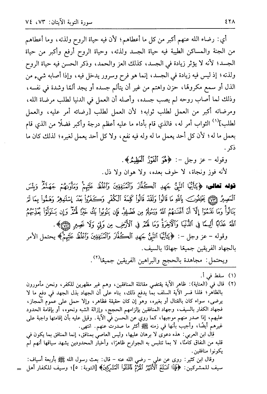 أي: رضاء اللَّه عنهم أكبر من كل ما أعطاهم؛ لأن فيه حياة الروح ولذته، وما أعطاهم من الجنة والمساكن الطيبة فيه حياة الجسد ولذته، وحياة الروح أرفع وأكبر من حياة الجسد؛ لأنه لا يؤثر زيادة في الجسد، كذلك العز والحمد، وذكر الحسن فيه حياة الروح ولذته؛ إذ ليس فيه زيادة في الجسد، إنما هو فرح وسرور يدخل فيه، وإذا أصابه شيء من الذل أو سمع مكروهًا، حزن واهتم من غير أن يتألم جسده أو يجد ألمًا وشدة في نفسه، وذلك لما أصاب روحه لم يصب جسده، وأصله أن العمل في الدنيا لطلب مرضاة اللَّه، ومرضاته أكبر من العمل لطلب ثوابه؛ لأن العمل لطلب رضائه أمر عليه، والعمل لطلب الثواب أمر له، فالذي قام بأداء ما عليه أعظم درجة وأكبر فضلًا من الذي قام بعمل ما له؛ لأن كل أحد يعمل ما له وله فيه نفع، ولا كل أحد يعمل لغيره؛ لذلك كان ما ذكر.